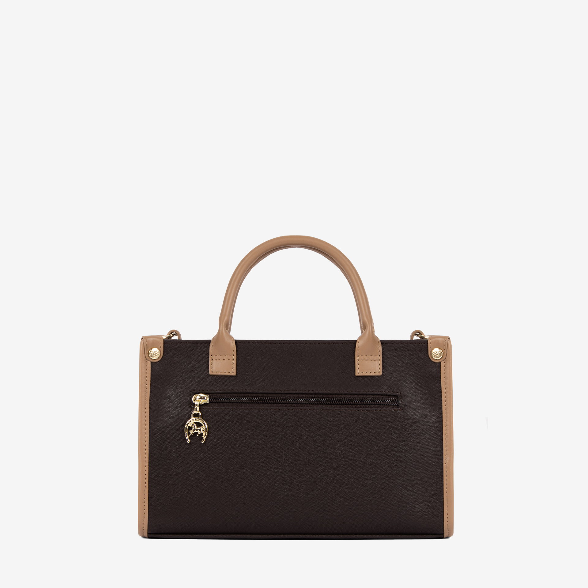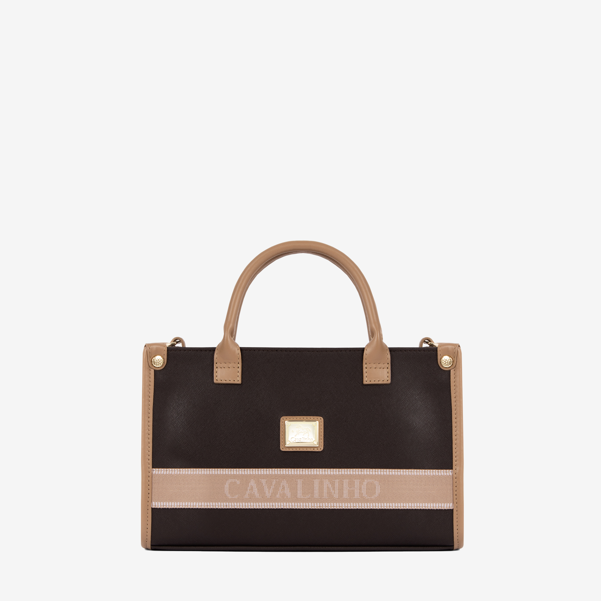 Mala de mão média em tela castanha com detalhes em pele genuína na cor bege. Divisória principal com forro em tecido, dois bolsos pequenos e com fecho de correr. Asa dupla de mão em pele genuína e alça tiracolo, ajustável e removível, em tecido - ambas na cor bege. Pormenor branding em tecido na frente e aplicações douradas.