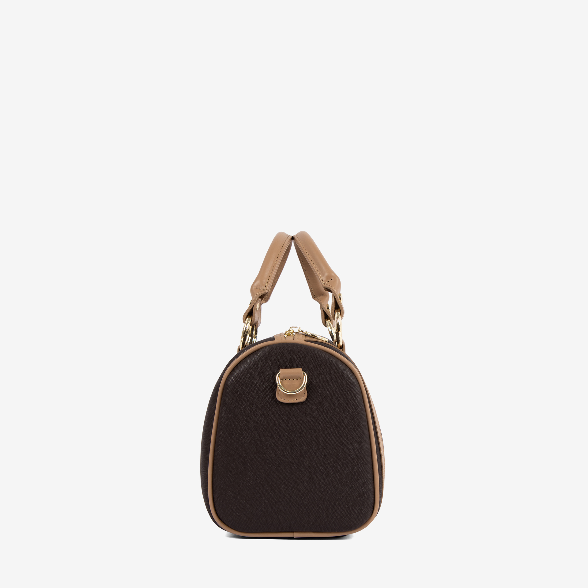 Mala de mão média em tela castanha, com detalhes em pele genuína na cor bege. Divisória principal com fecho de correr e forro personalizado. Asa dupla de mão em pele genuína e alça tiracolo, ajustável e removível, em tecido - ambas na cor bege. Pormenor branding em tecido na frente e aplicações douradas.
