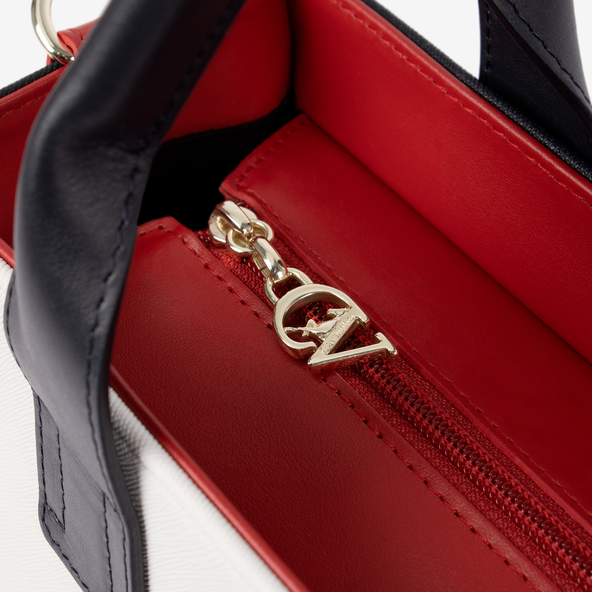 Mala de mão em tela nas cores azul, branco e vermelho. Divisória principal com forro em tecido, dois bolsos pequenos e fecho de correr. Asa dupla de mão em pele e alça de tiracolo, amovível e ajustável, em tecido - ambas na cor azul. Pormenor branding no tecido. Aplicações douradas.