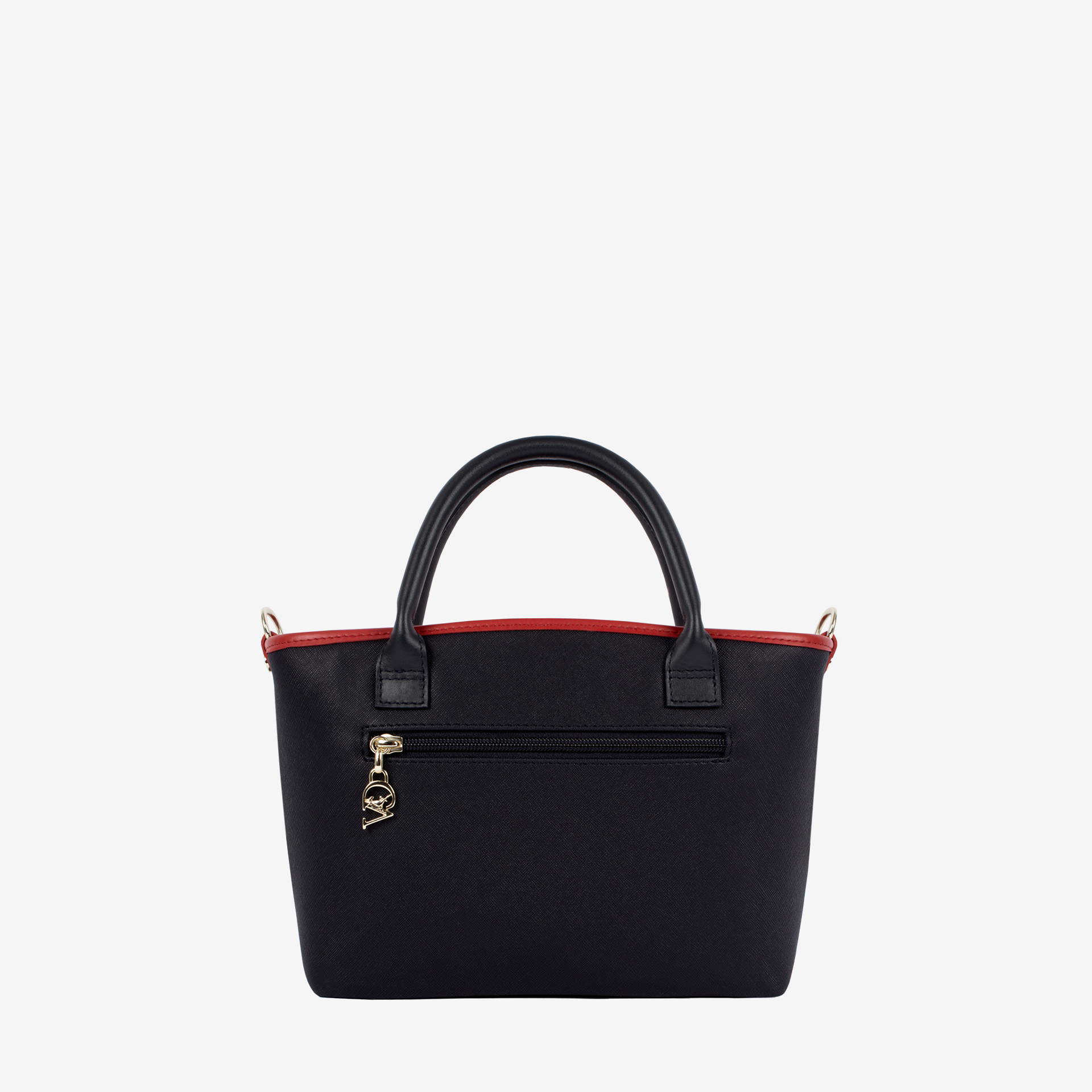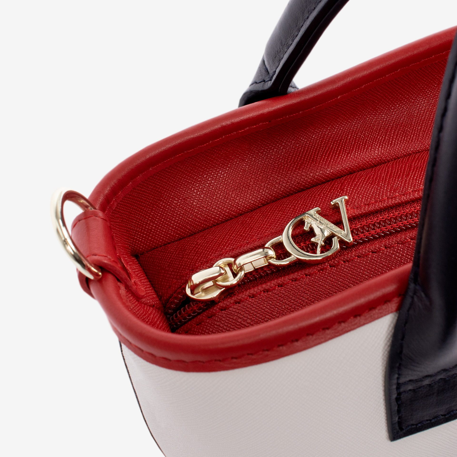 Mala média em tela de cor azul-vermelho. Divisória principal com forro em tecido, dois bolsos interiores pequenos e fecho de correr. Bolso com fecho de correr na parte da trás da mala. Asa dupla de mão e alça de tiracolo ajustável e removível. Aplicações douradas.