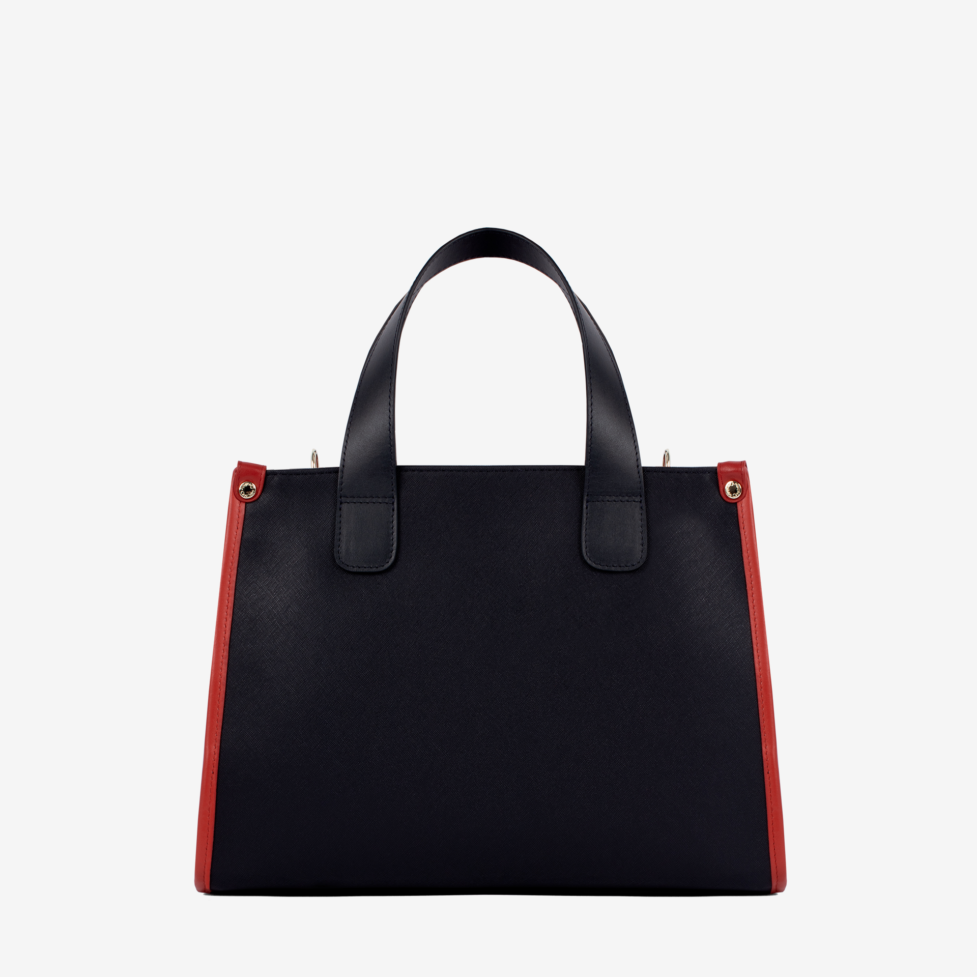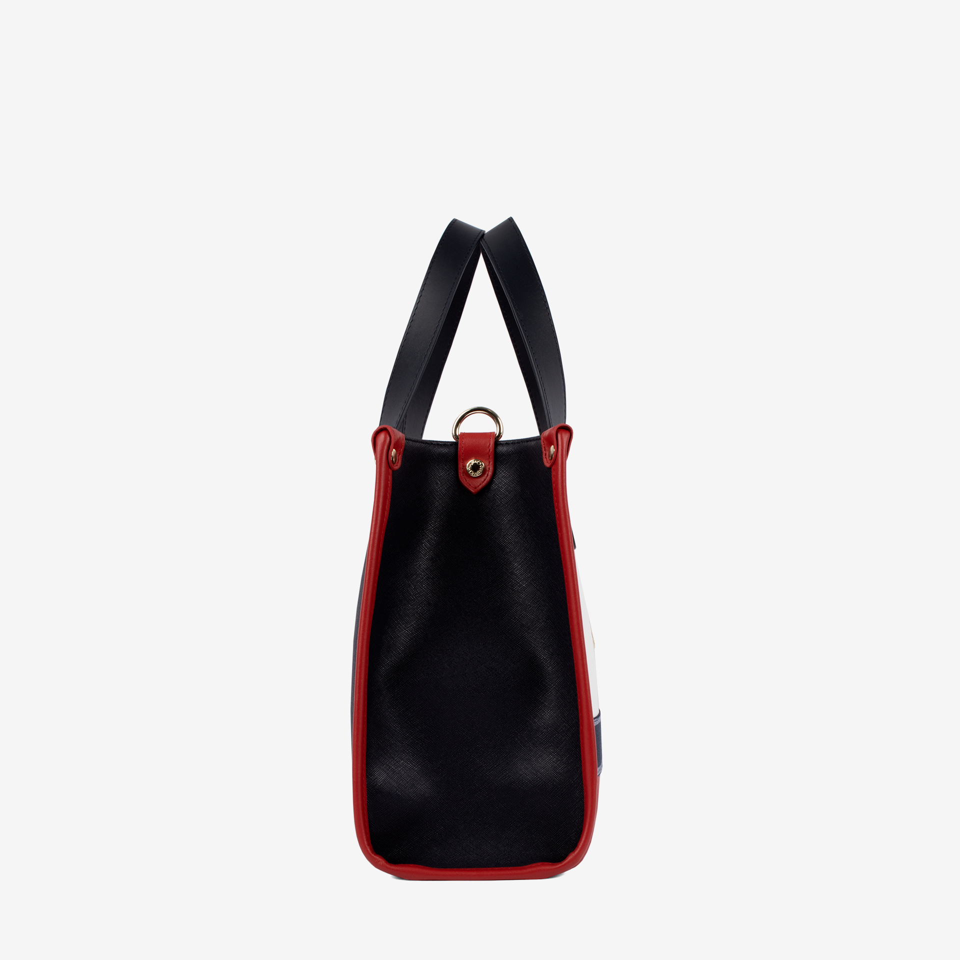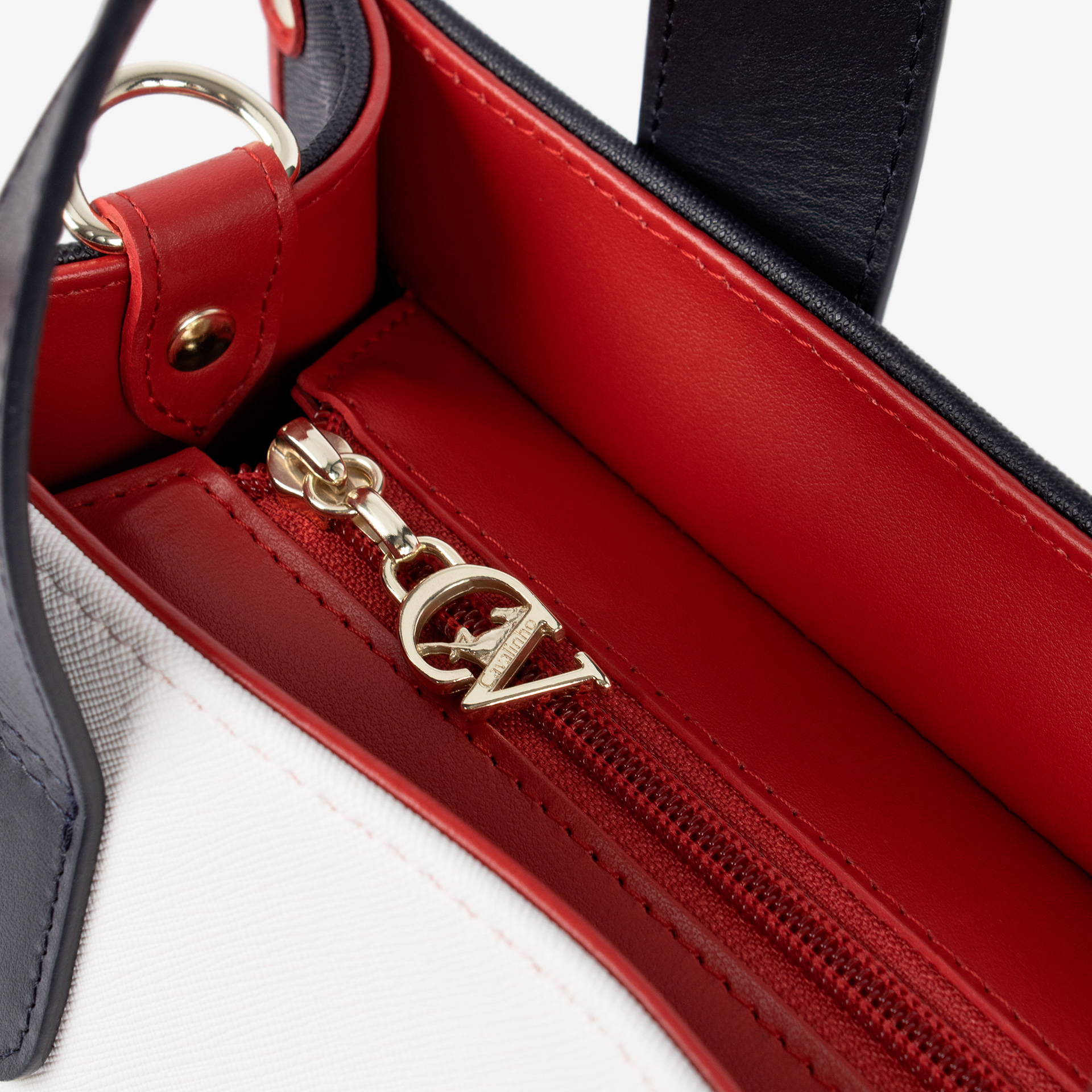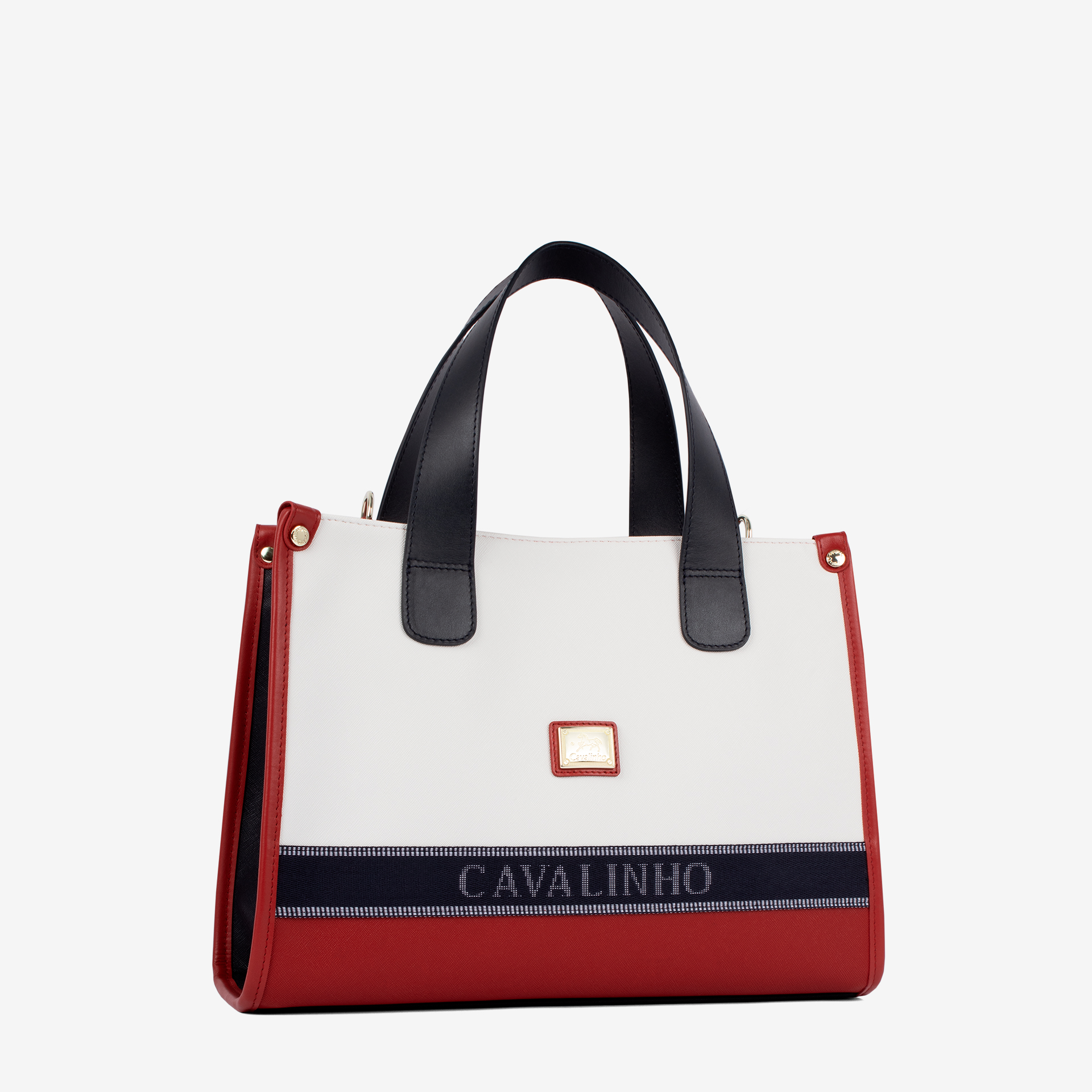 Mala de mão grande em tela nas cores azul, branco e vermelho. Divisória principal com forro em tecido, dois bolsos pequenos e fecho de correr. Asa dupla de mão em pele genuína azul e alça de ombro, ajustável e removível, em tecido azul. Pormenor branding em tecido na frente e aplicações douradas. Mini necessaire com alça de mão no interior (removível).