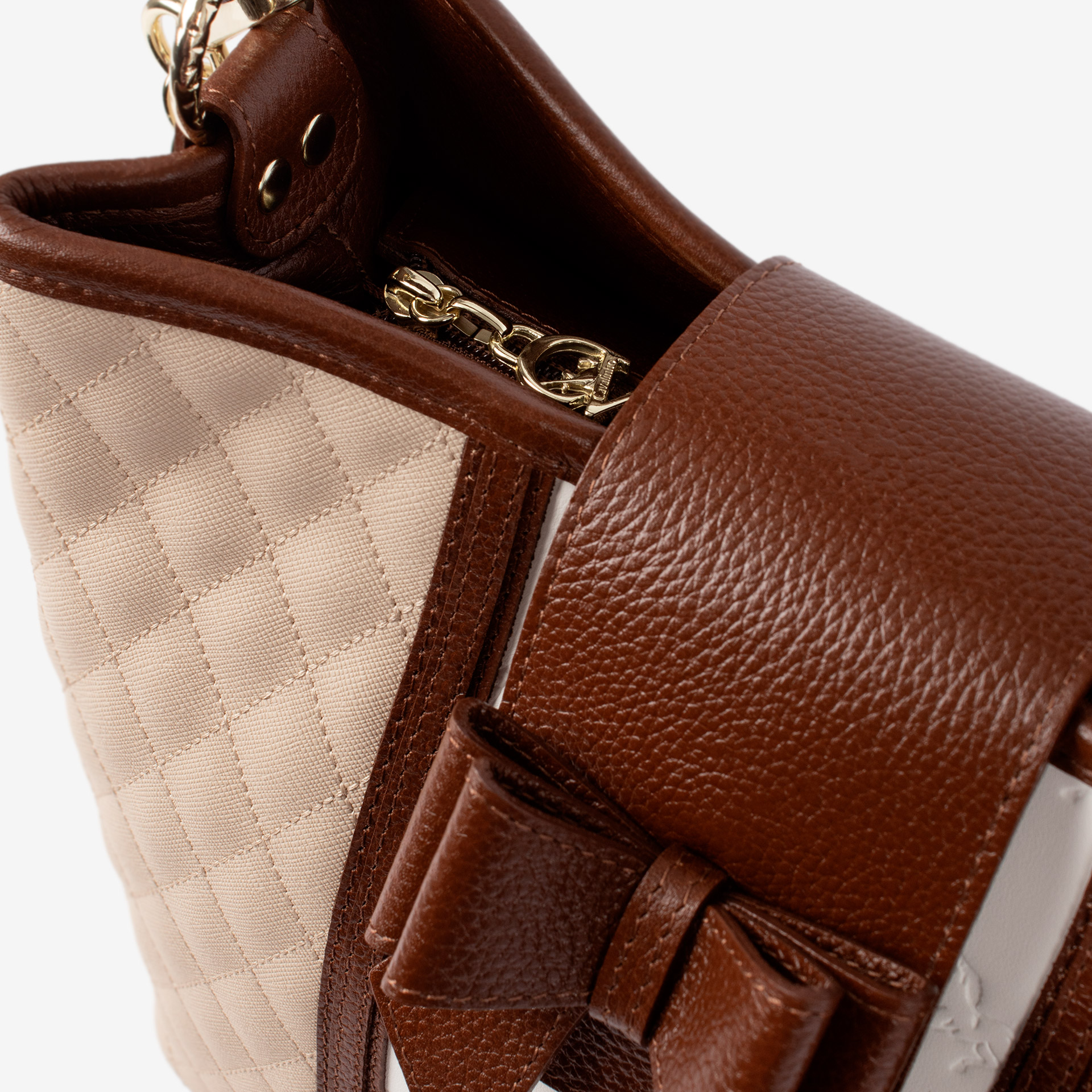 Mala de mão em tela padronizada nas cores bege, branco, camel e com detalhes em pele genuína. Aba com botão magnético para acesso à divisória principal que possui cinco compartimentos, dois livres, dois com fecho de correr e um para telemóvel. Forro em tecido. Asa de mão e alça de ombro removível e ajustável. Aplicações douradas.