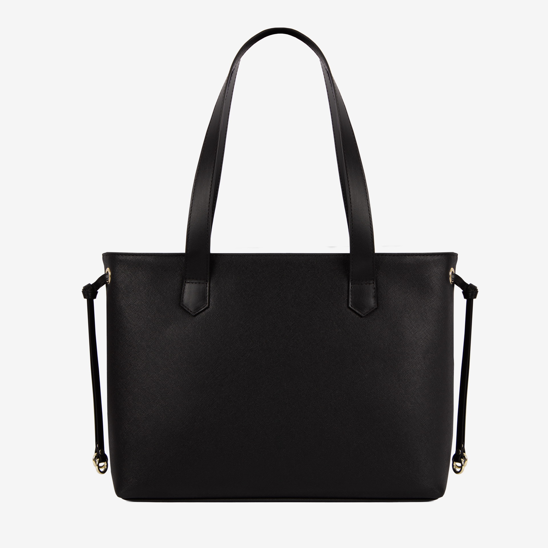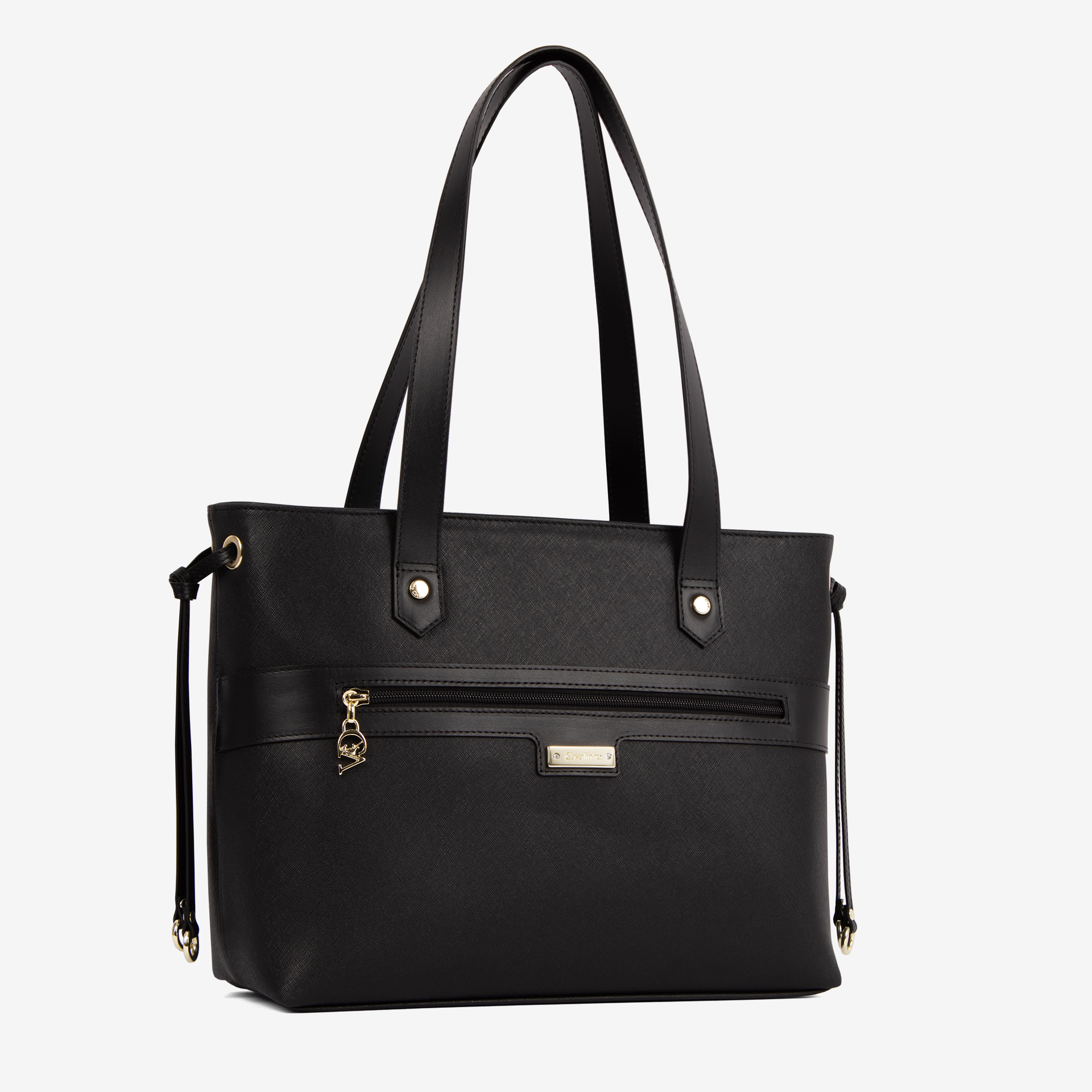 Mala de ombro grande em tela com detalhes em pele genuína, na cor preto. Divisória principal com dois bolsos pequenos e fecho de correr. Bolso pequeno com fecho de correr na parte da frente da mala. Asa dupla de ombro e duas fivelas de ajuste nas laterais, em pele genuína. Aplicações douradas.
