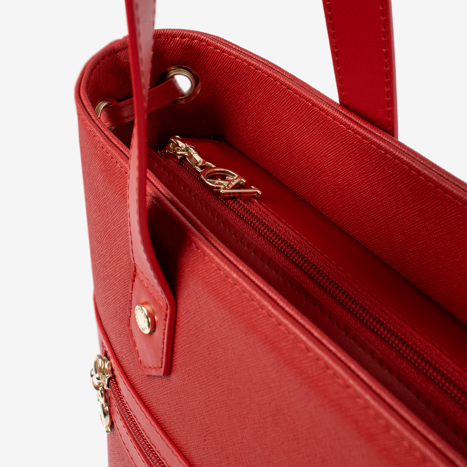 Mala de ombro grande em tela vermelha, com detalhes em pele genuína. Divisória principal com dois bolsos pequenos e fecho de correr. Bolso pequeno com fecho de correr na parte da frente da mala. Asa dupla de ombro e duas fivelas de ajuste nas laterais, em pele genuína. Aplicações douradas.