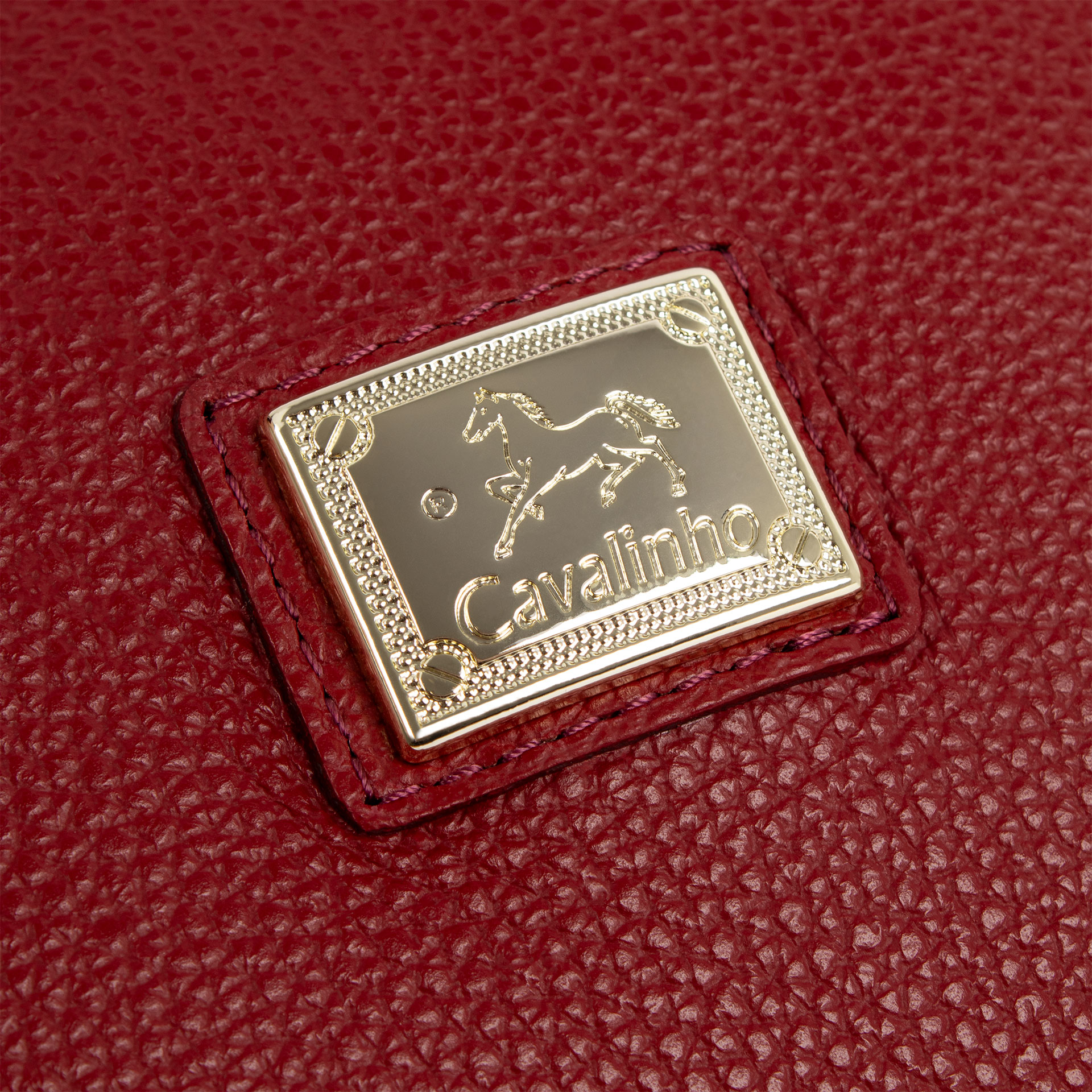 Mala média de ombro em pele genuína na cor bordô. Divisória principal com dois bolsos pequenos. Fecho com aba e torniquete. Asa fixa de ombro e alça tiracolo, ajustável e removível, também em pele genuína bordô. Aplicações douradas.