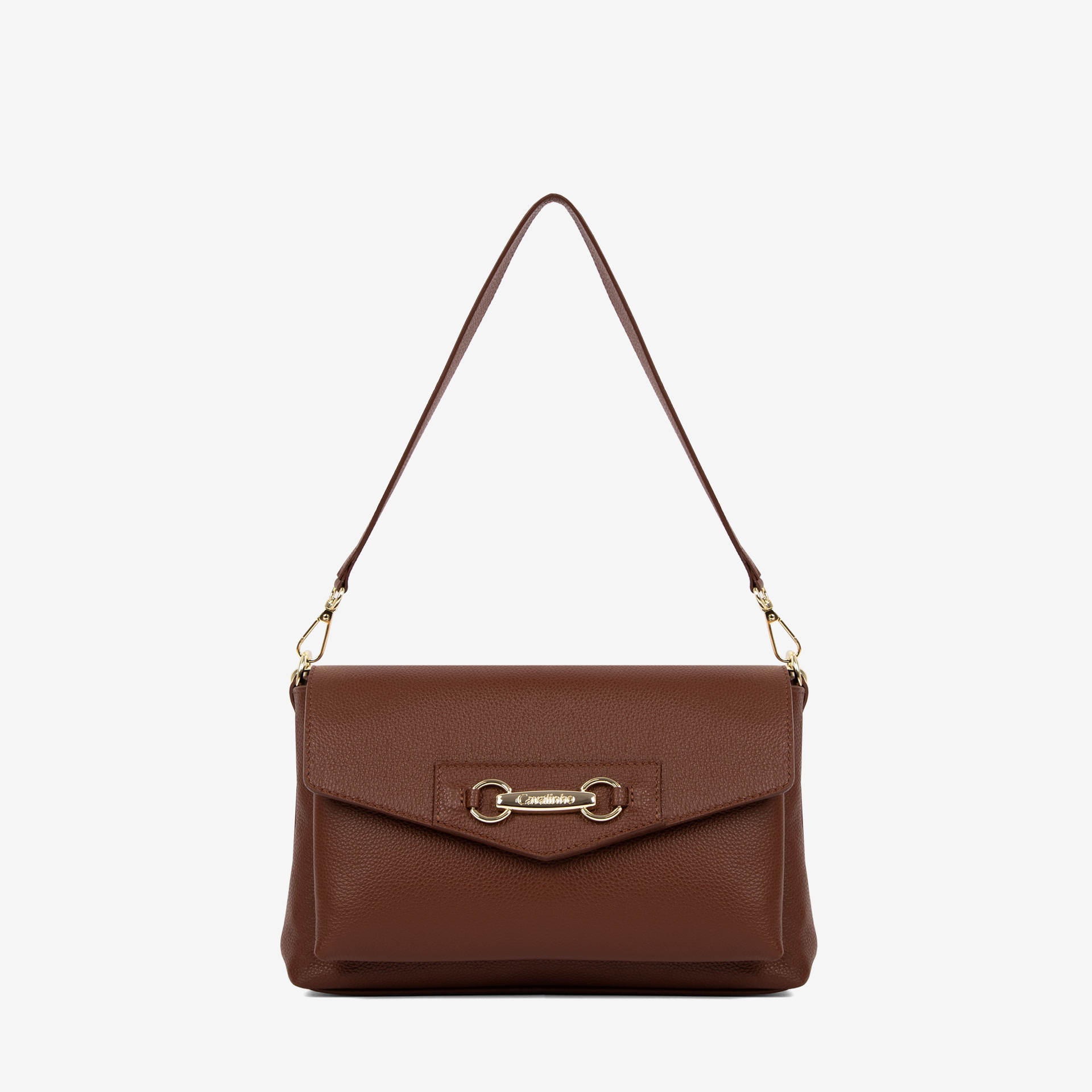 Mala média de ombro em pele genuína, na cor camel. Divisória principal com forro em tecido e dois compartimentos, um com fecho de correr e outro livre. Alça de ombro e alça de tiracolo ajustável (ambas removíveis). Aplicações douradas.