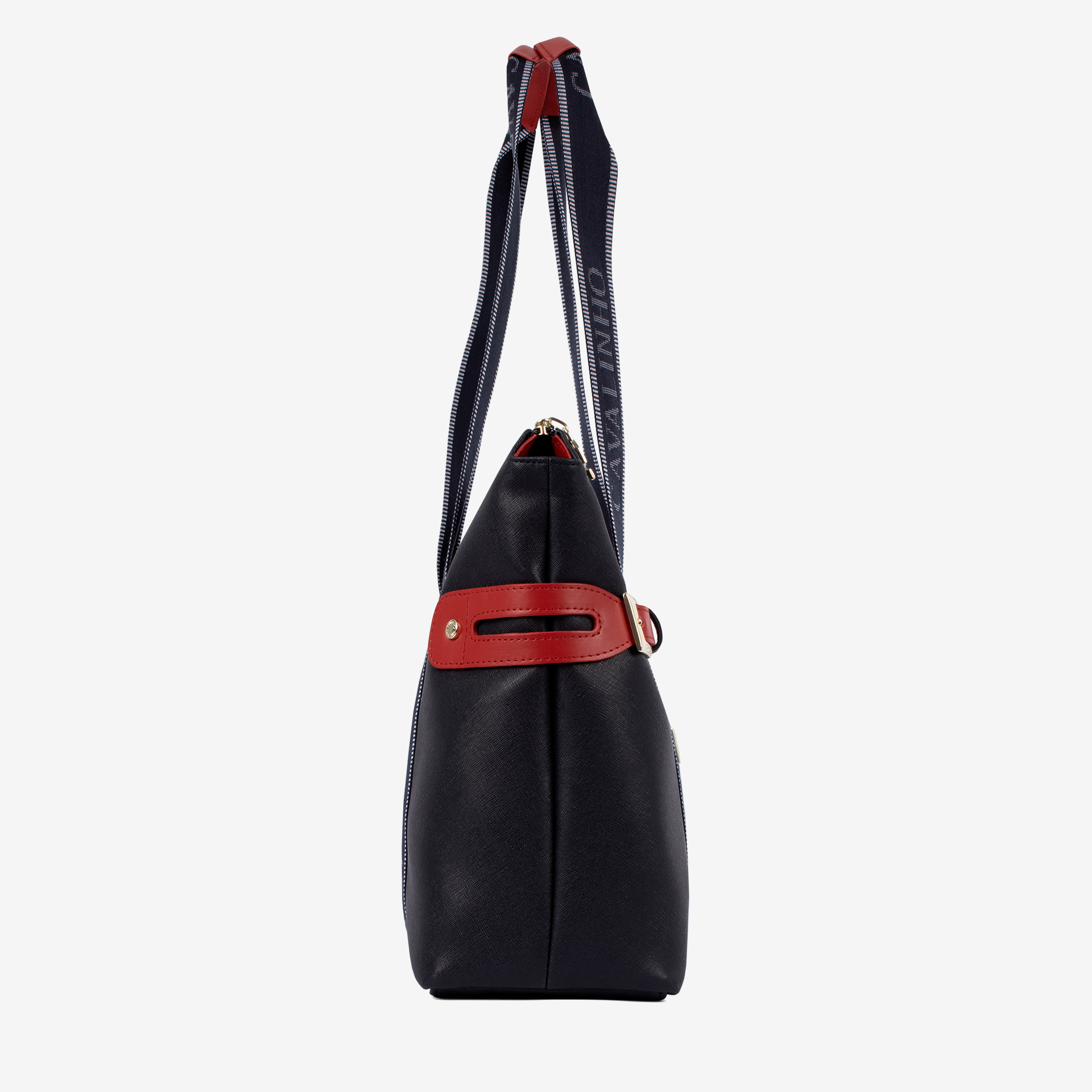 Mala grande em tela nas cores azul, branco e vermelho. Divisória principal com forro em tecido, compartimento com fecho de correr a meio da mala e dois bolsos pequenos. Alças de ombro em tecido e detalhe de reforço em pele genuína, ambas na cor azul. Pormenor branding em tecido na frente. Aplicações douradas.