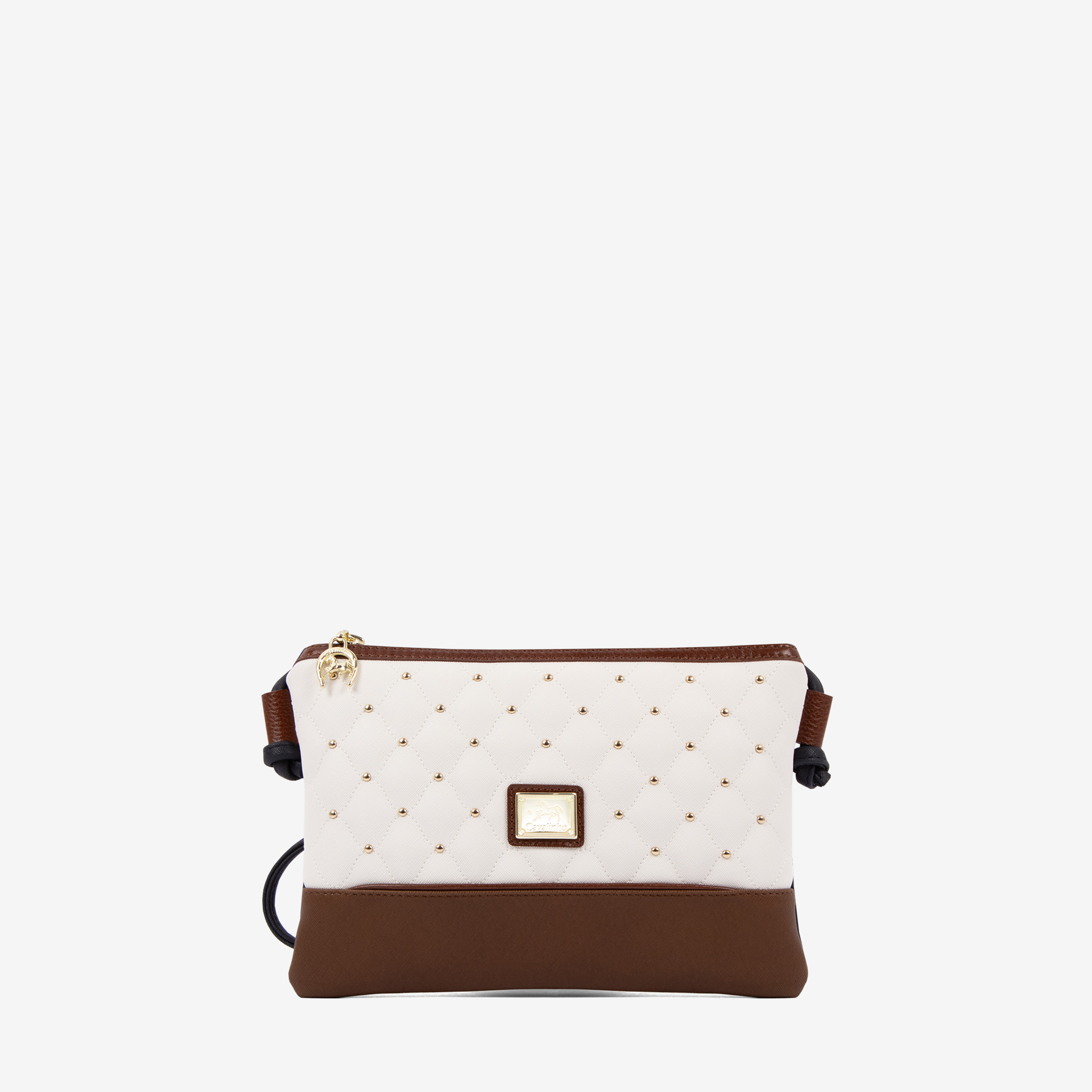 Mala de tiracolo pequena numa fusão de telas na cor azul, camel e branco. Tachas douradas cravadas na tela e detalhes em pele genuína camel. Divisória principal com forro em tecido, dois bolsos pequenos e fecho de correr. Bolso pequeno com fecho de correr na parte de trás da mala. Alça de tiracolo fixa na cor azul. Aplicações douradas.