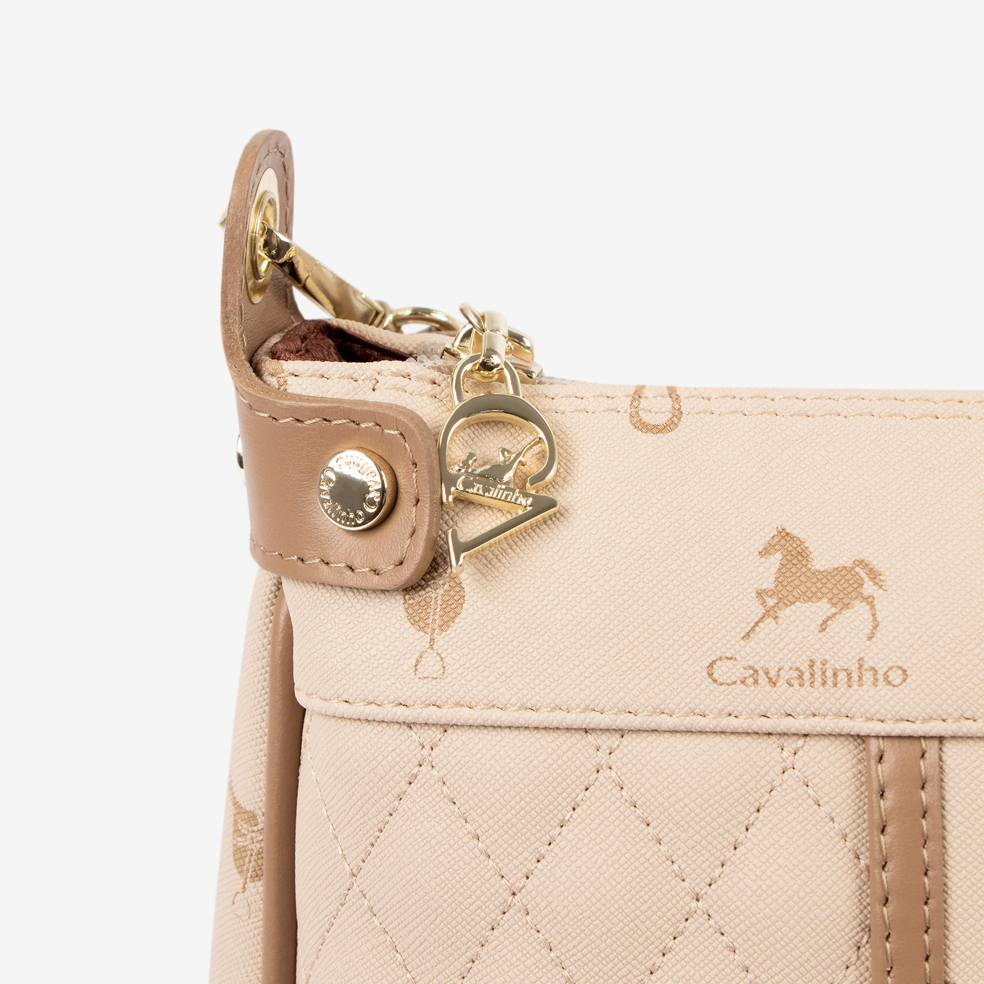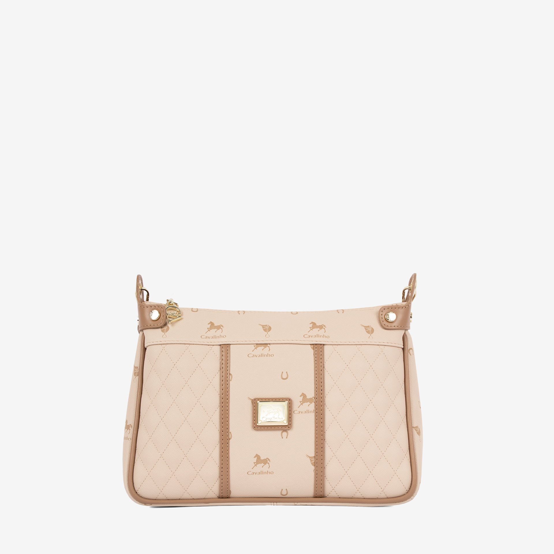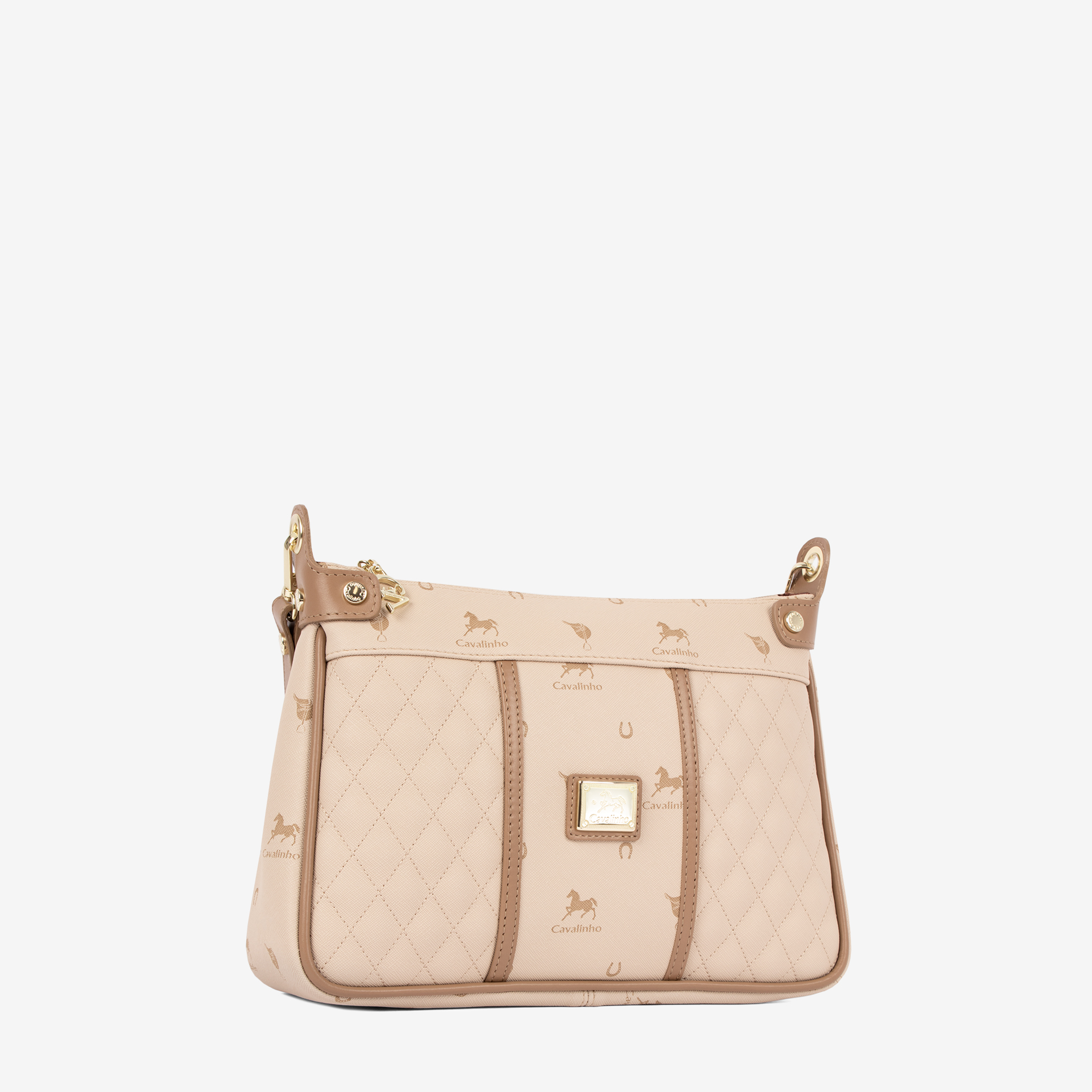 Mala média em tela com padrão losangular na cor bege. Divisória principal com forro em tecido, dois bolsos pequenos e fecho de correr. Bolso com fecho de correr na parte de trás da mala. Alça de tiracolo, amovível e ajustável, em pele genuína bege. Aplicações douradas.