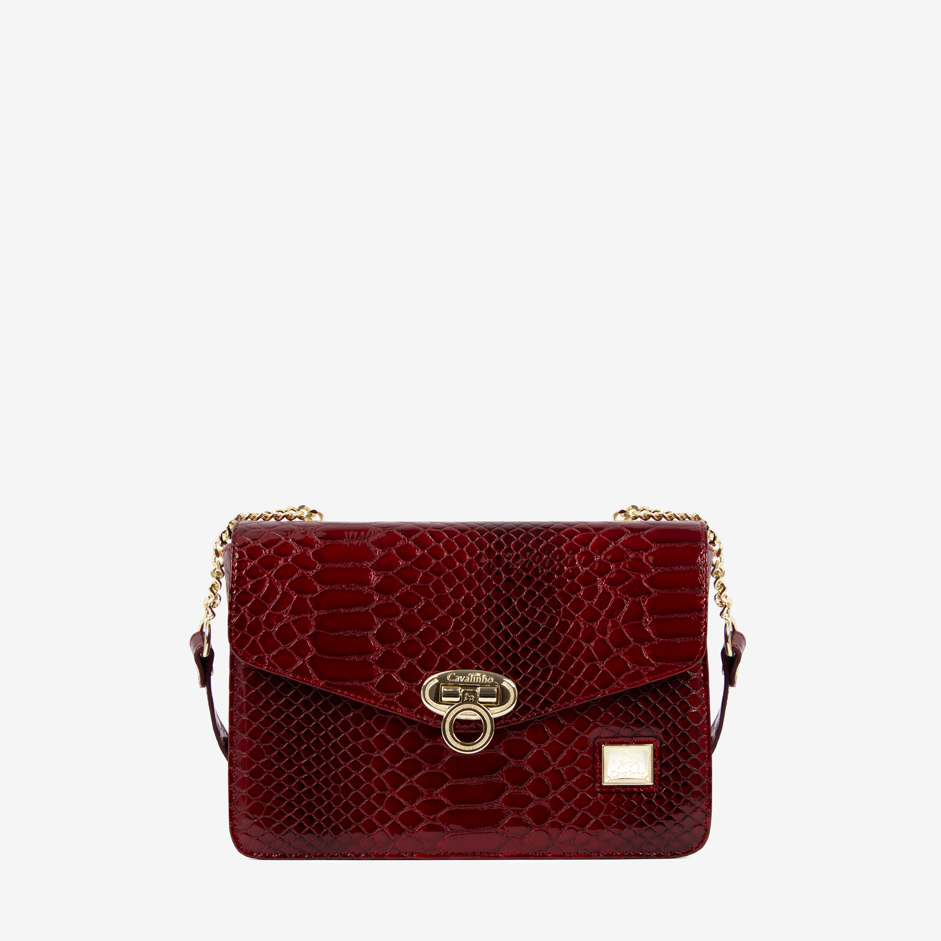 Mala média de tiracolo em pele envernizada com gravação. Divisória com forro em tecido, dois bolsos pequenos no interior e fecho de correr. Aba com aplicação para abertura. Alça de ombro ajustável também em pele envernizada com detalhes de corrente dourada. Aplicações douradas.