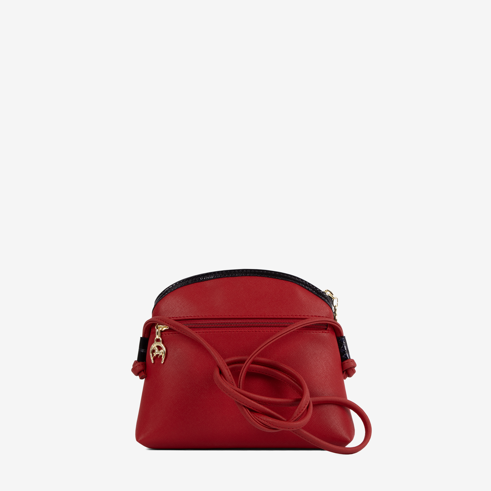 Mala de tiracolo pequena numa mistura de pele envernizada e genuína nas cores azul, vermelho e bege. Divisória principal com forro em tecido, dois bolsos pequenos no interior e fecho de correr. Bolso na parte de trás da mala. Alça de tiracolo fina e aplicações em dourado.