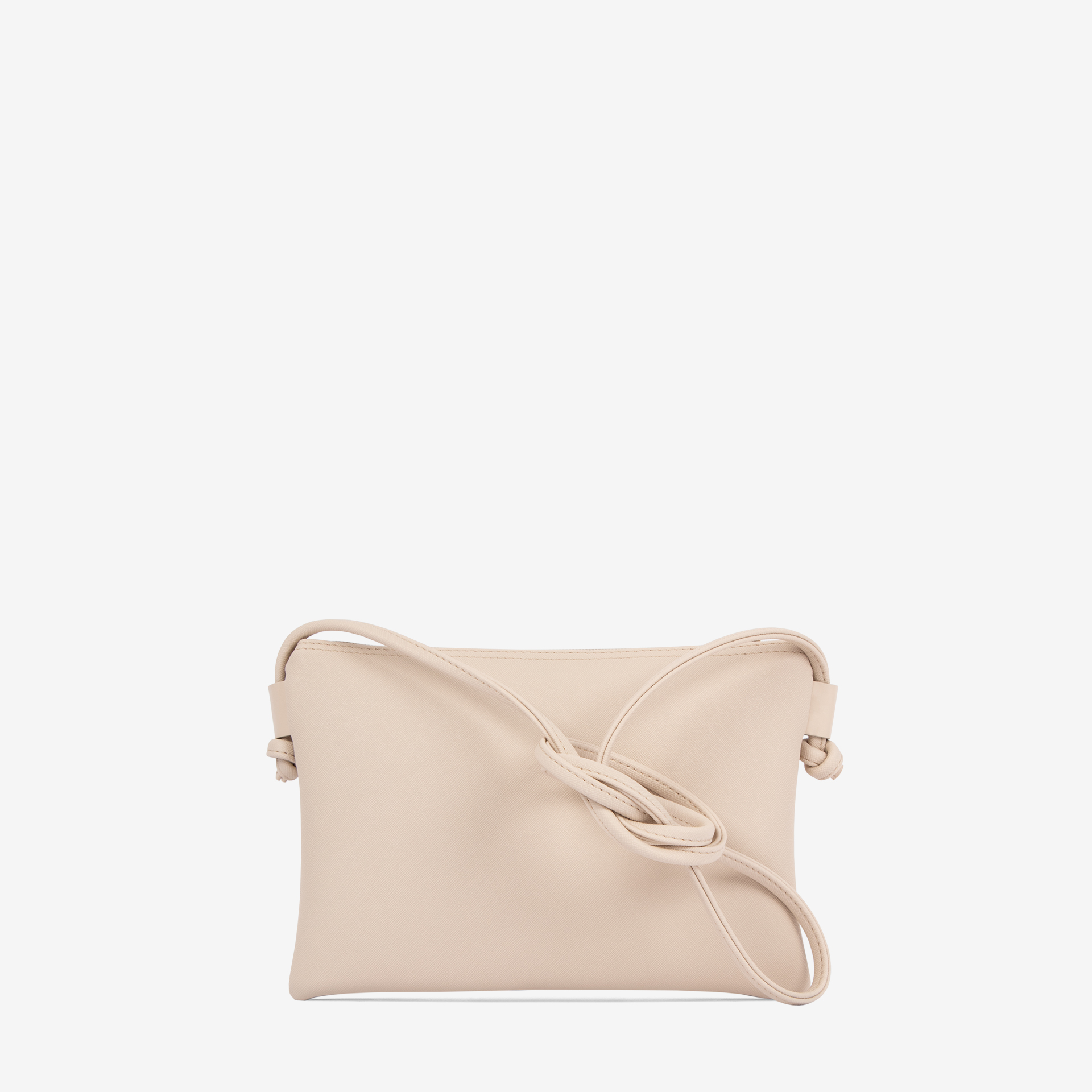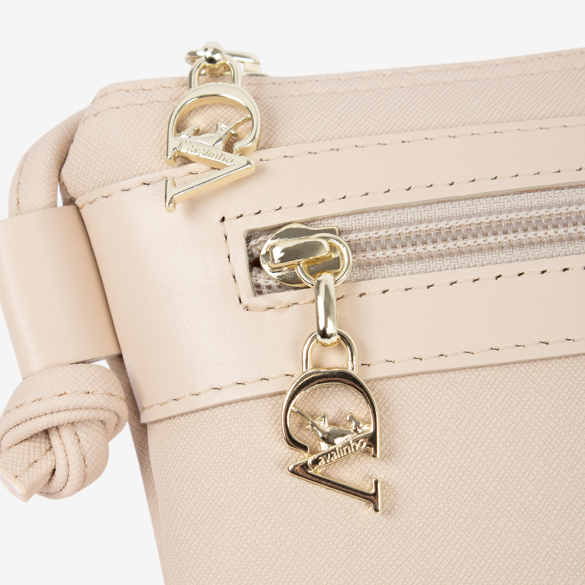 Mala de tiracolo pequena em tela bege, com detalhes em pele genuína. Divisória principal com forro em tecido, dois bolsos pequenos e fecho de correr. Bolso com fecho de correr na parte da frente da mala. Alça de tiracolo fixa em tela e aplicações douradas.