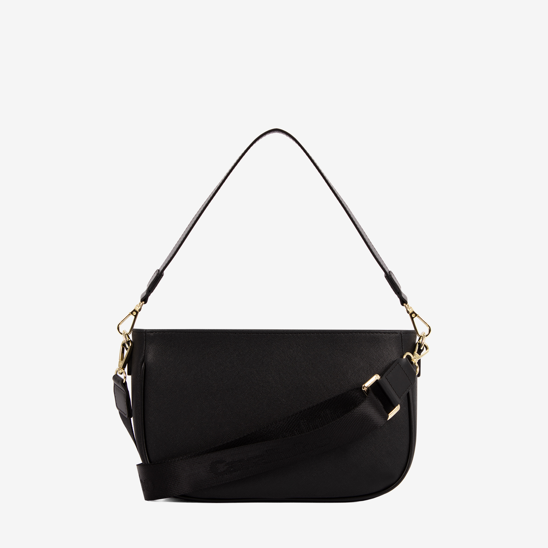 Mala de ombro em tela com detalhes em pele genuína, na cor preto. Divisória principal com fecho de correr, forro personalizado e dois bolsos pequenos. Asa de ombro em pele genuína e alça de tiracolo, amovível e ajustável, em tecido. Aplicações douradas.