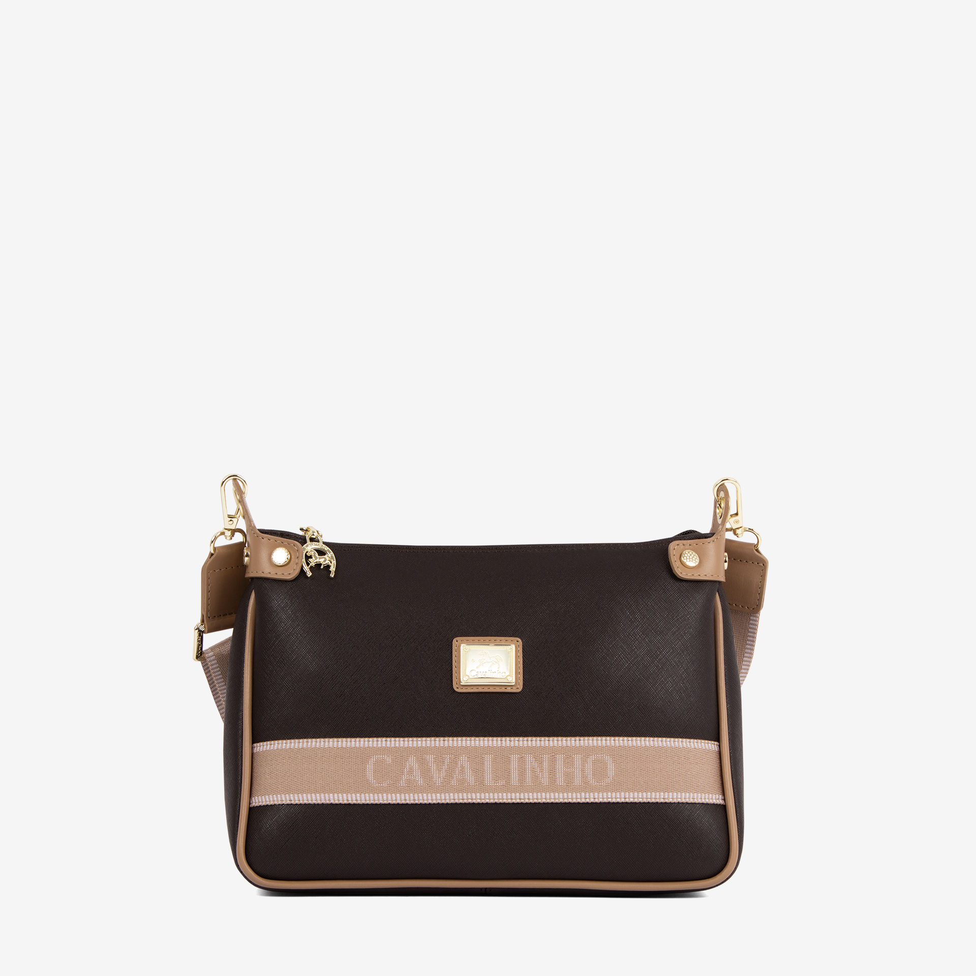 Mala média em tela castanha com detalhes em pele genuína na cor bege. Divisória principal com forro em tecido, dois bolsos pequenos e fecho de correr. Bolso exterior com fecho de correr na parte de trás da mala. Alça de tiracolo amovível e ajustável em tecido bege. Pormenor branding em tecido na frente. Aplicações douradas.