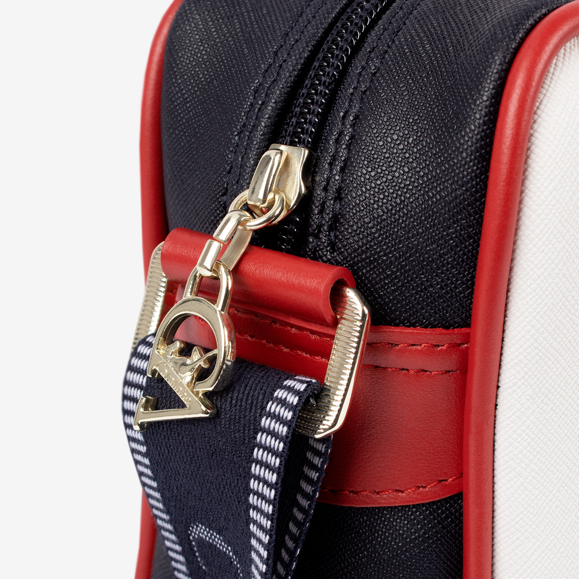 Mala de tiracolo média em tela nas cores azul, branco e vermelho. Divisória principal com forro em tecido, dois bolsos pequenos e fecho de correr. Bolso pequeno com fecho de correr na frente da mala. Alça de tiracolo ajustável em tecido azul. Pormenor branding em tecido na frente e aplicações douradas.