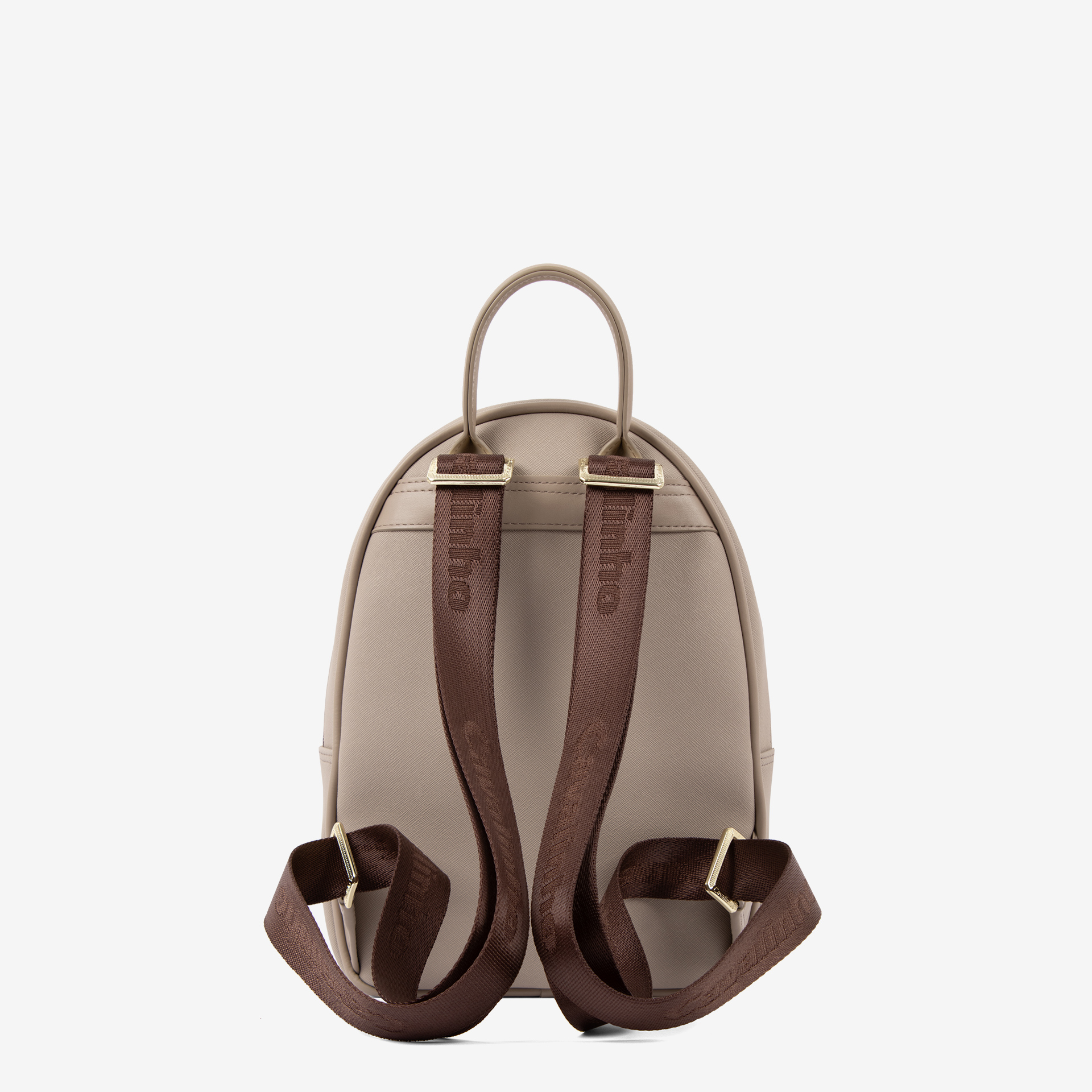 Mochila média em tela cinza, com detalhes em pele genuína. Divisória principal com forro em tecido, dois bolsos pequenos e fecho de correr. Bolso com fecho de correr na parte da frente da mochila. Alça de mão em pele genuína bege e duas alças de tecido ajustáveis, na cor castanho, para utilizar às costas. Aplicações douradas.