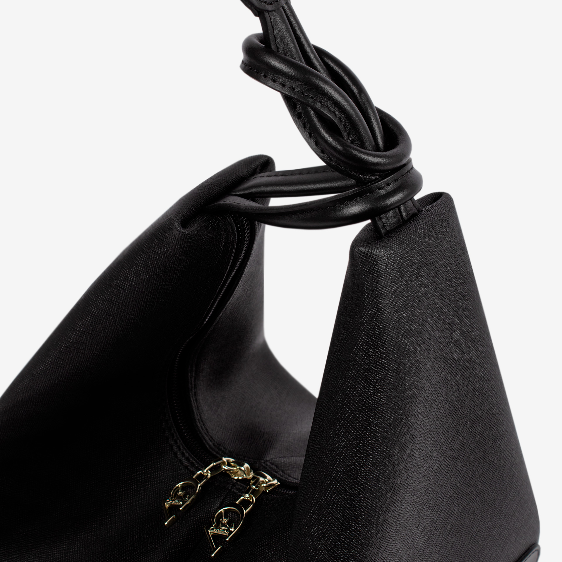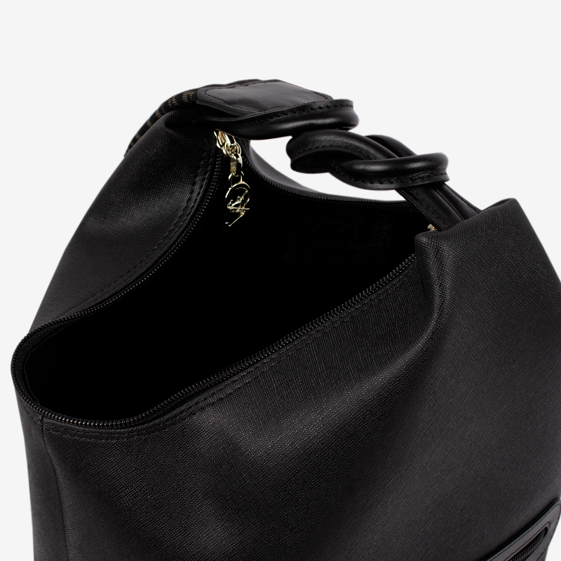Mochila em tela com detalhes em pele genuína na cor preto. Divisória com forro em tecido e fecho de correr duplo. Dois bolsos pequenos no interior. Bolso com fecho de correr na parte da frente da mochila. Alças em tecido ajustáveis com fecho. Pormenor branding no tecido. Aplicações douradas.