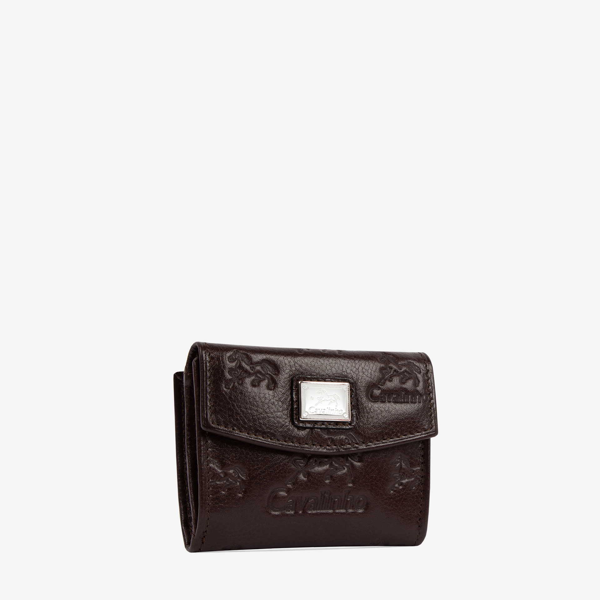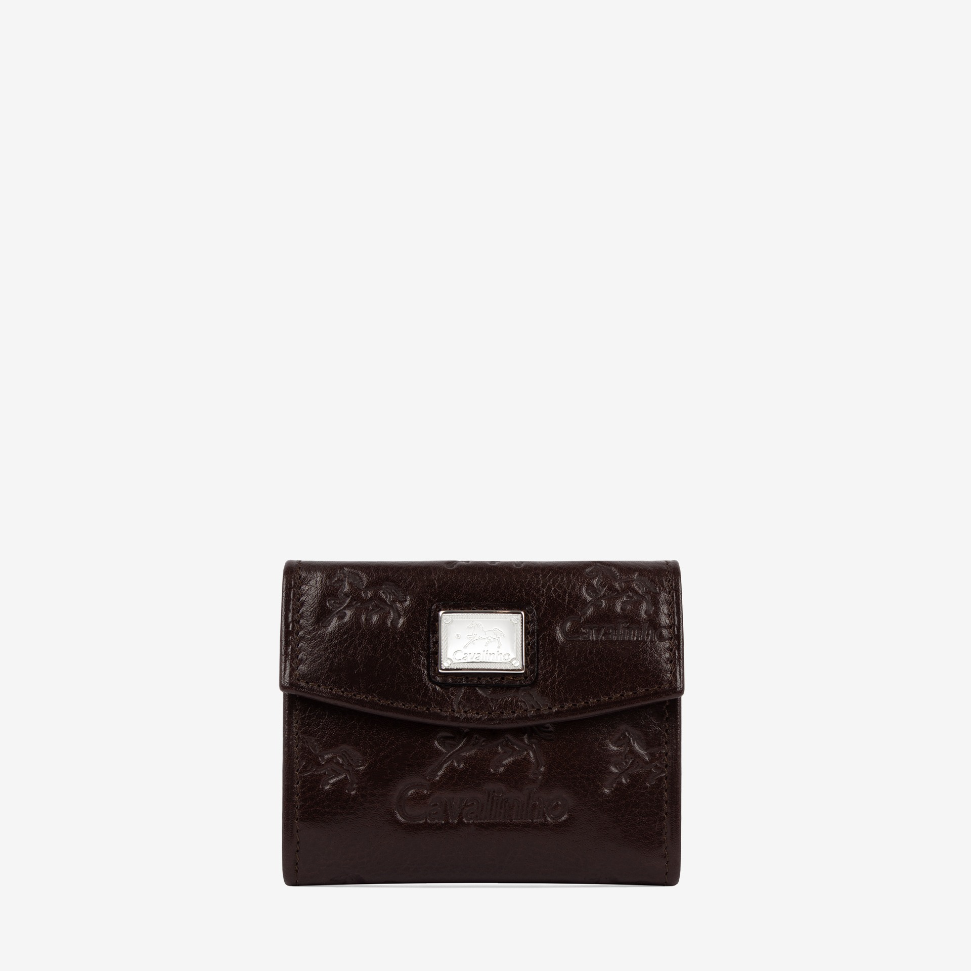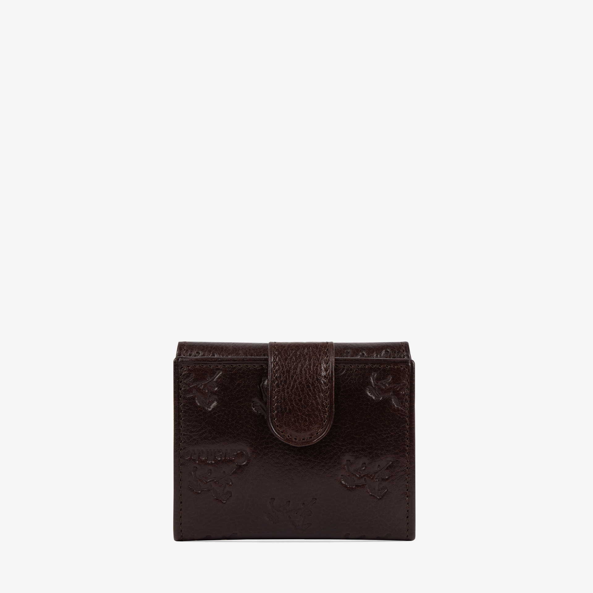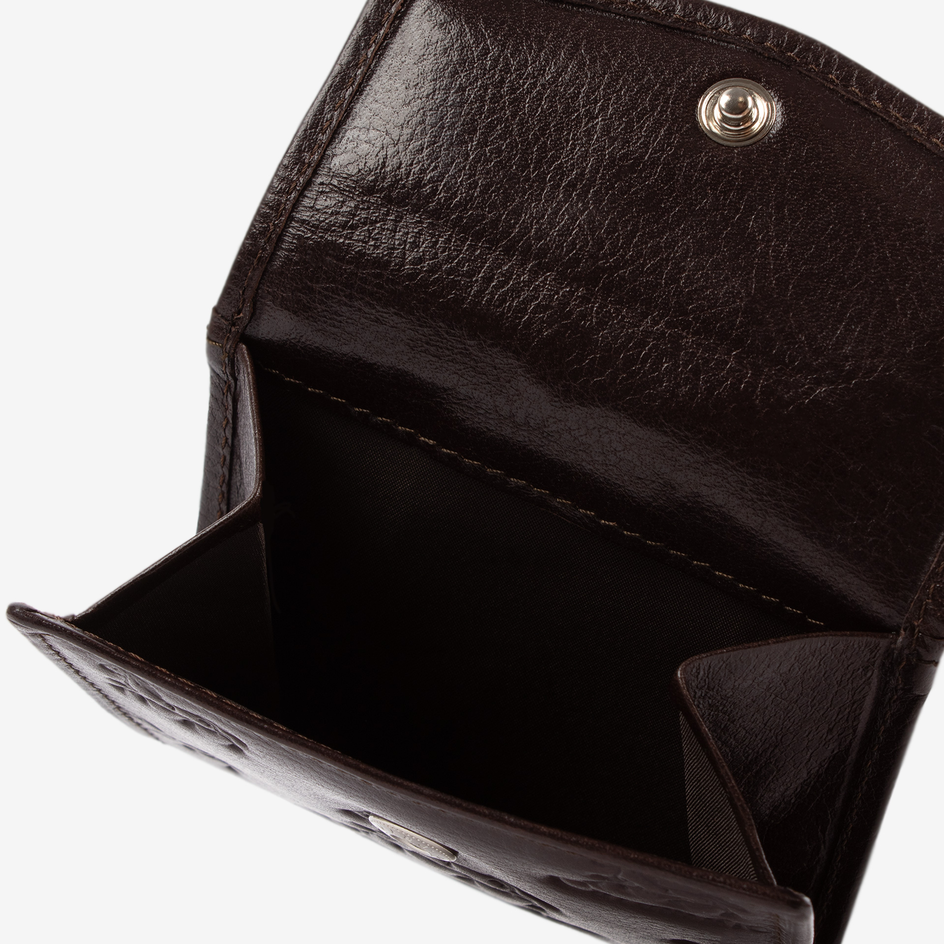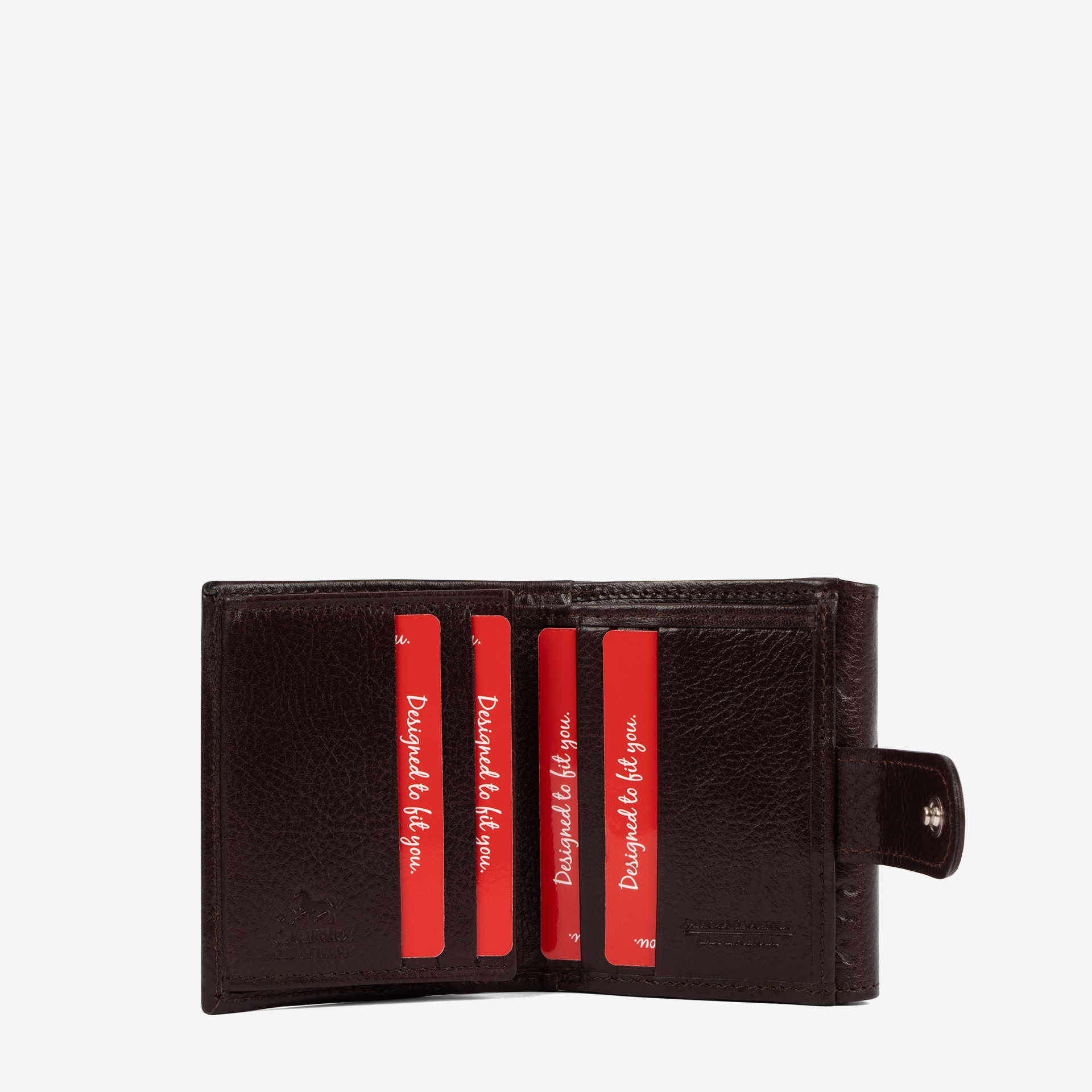 Carteira em pele genuína com gravação na cor castanho. Uma divisória com fecho de mola, capacidade para nove cartões, uma bolsa transparente e um compartimento para notas e, uma segunda divisória, livre, para moedas, também com fecho de mola.