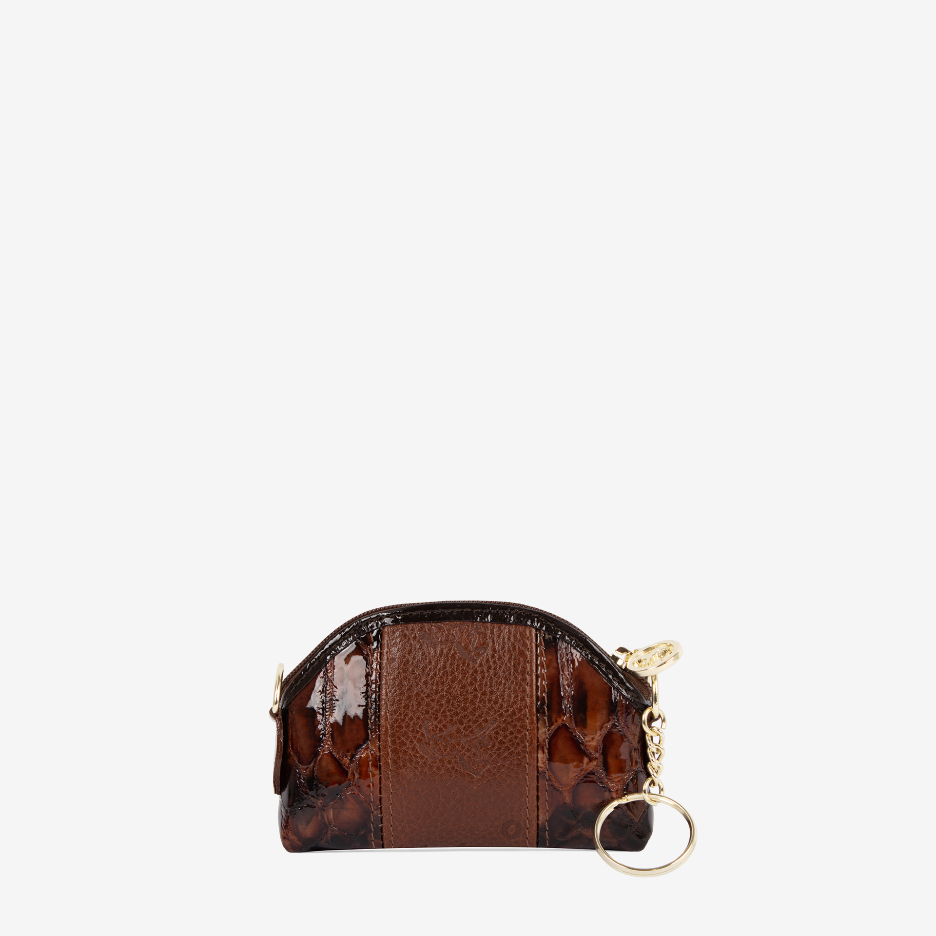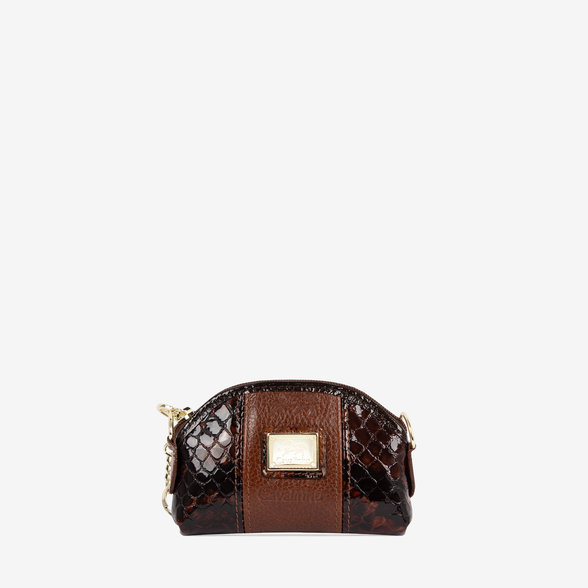 Moedeiro em pele envernizada e genuína, na cor camel. Fecho de correr e uma argola para colocar chaves no interior. Aplicações douradas.