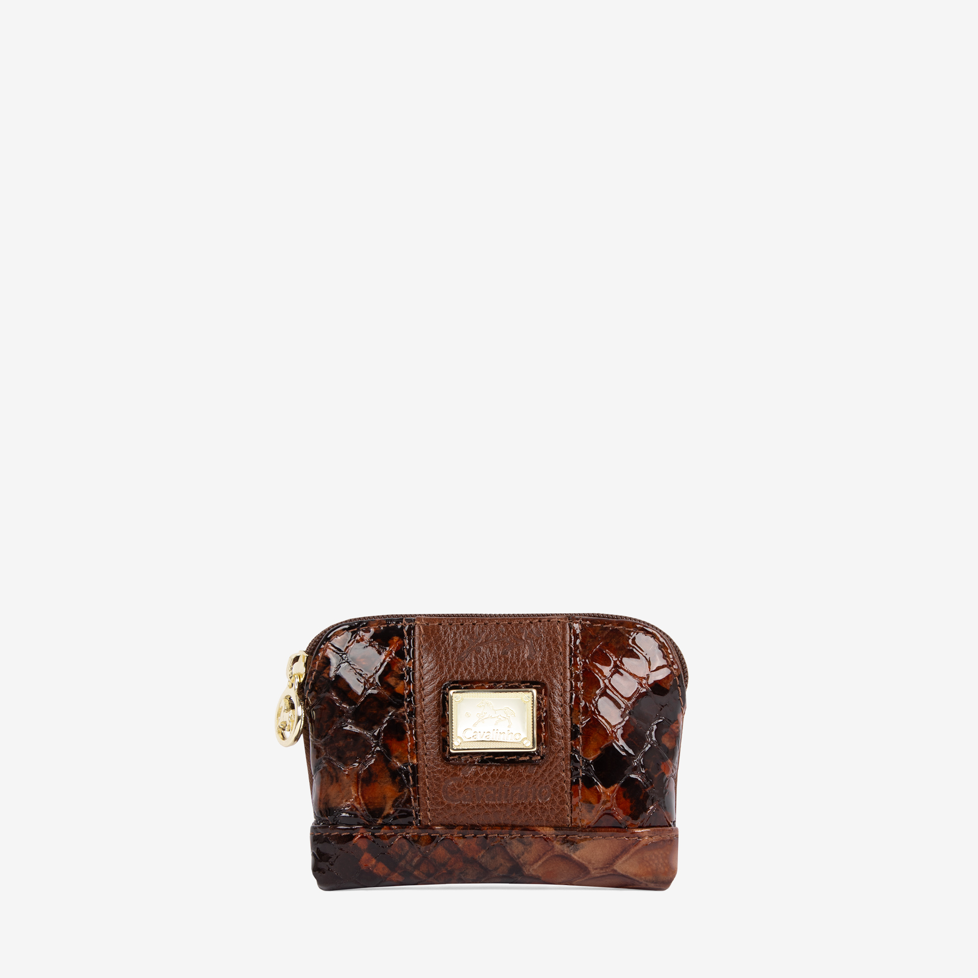 Moedeiro com fecho de correr. Detalhes em pele envernizada e genuína. Aplicações douradas.