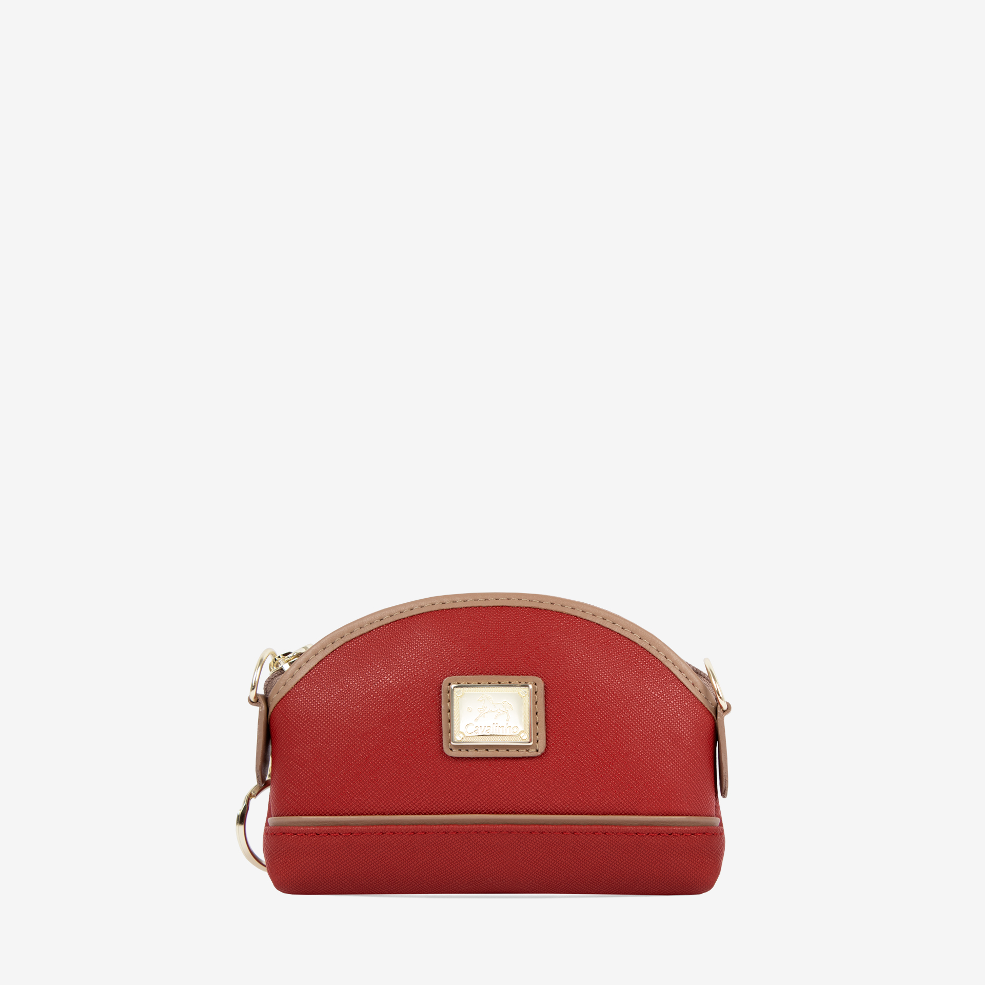 Moedeiro em tela vermelha, forro em tecido e fecho de correr. Argola para colocar chaves no interior. Detalhes em pele genuína e e aplicações douradas.