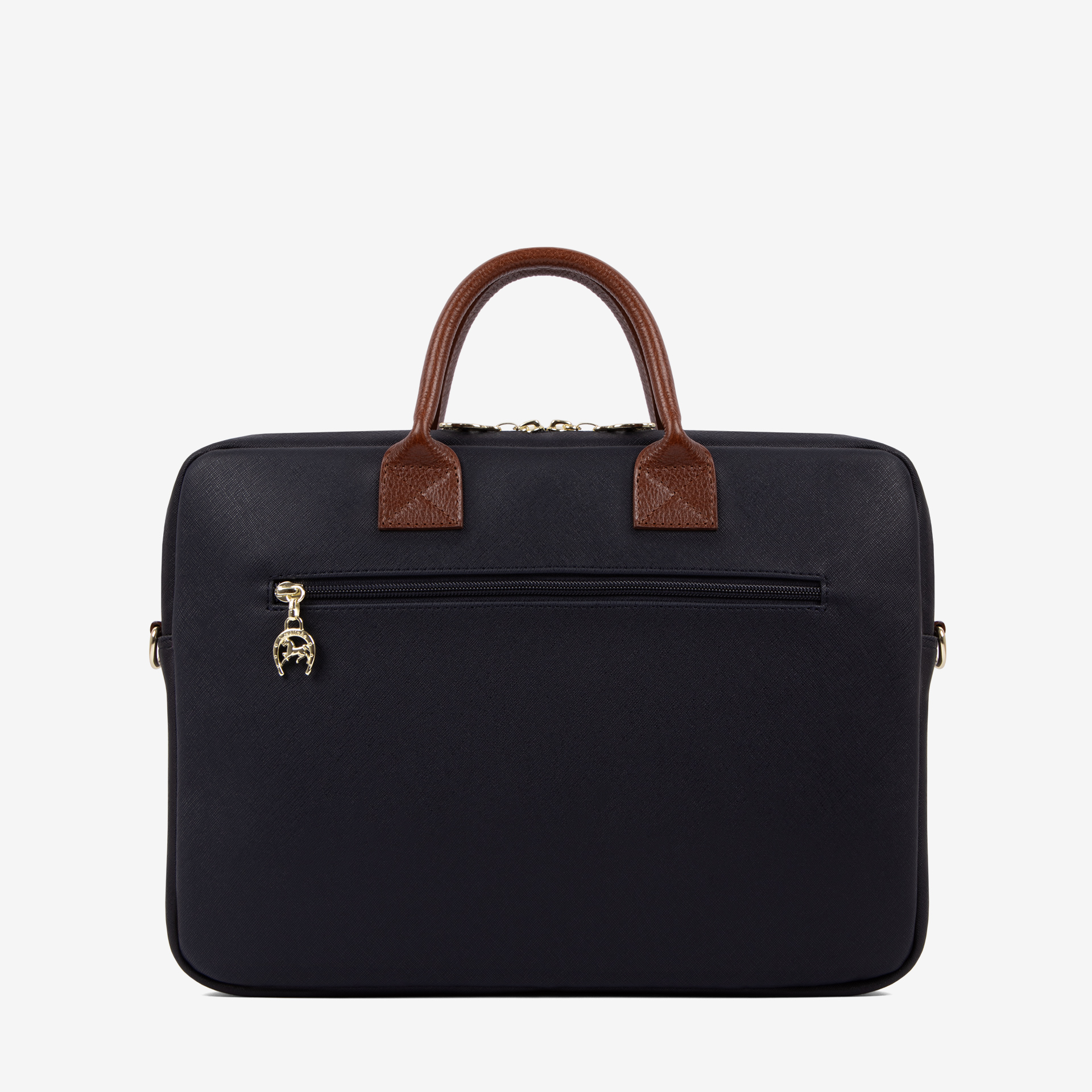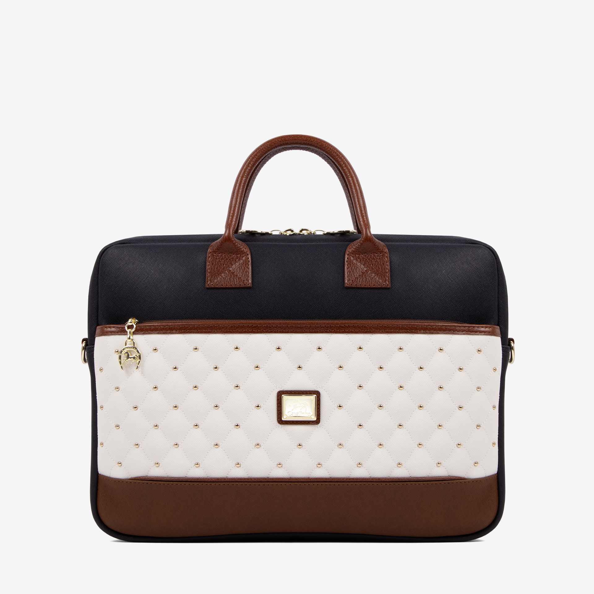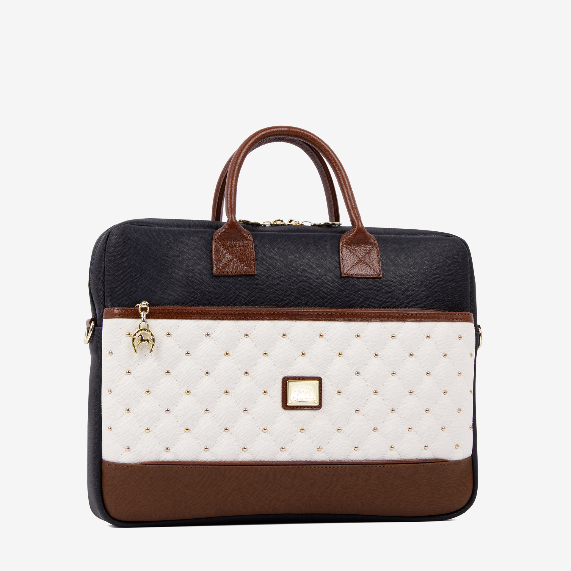 Pasta de computador numa fusão de telas na cor azul, camel e branco. Tachas douradas cravadas na tela e detalhes em pele genuína camel. Divisória principal com forro em tecido, compartimento para portátil com aba de velcro para proteção e fecho de correr duplo. Bolso médio na frente e bolso pequeno na parte de trás da pasta, ambos com fecho de correr. Asa dupla de mão em pele genuína e alça de tiracolo em tecido azul, com proteção de ombro em pele genuína camel. Aplicações douradas.