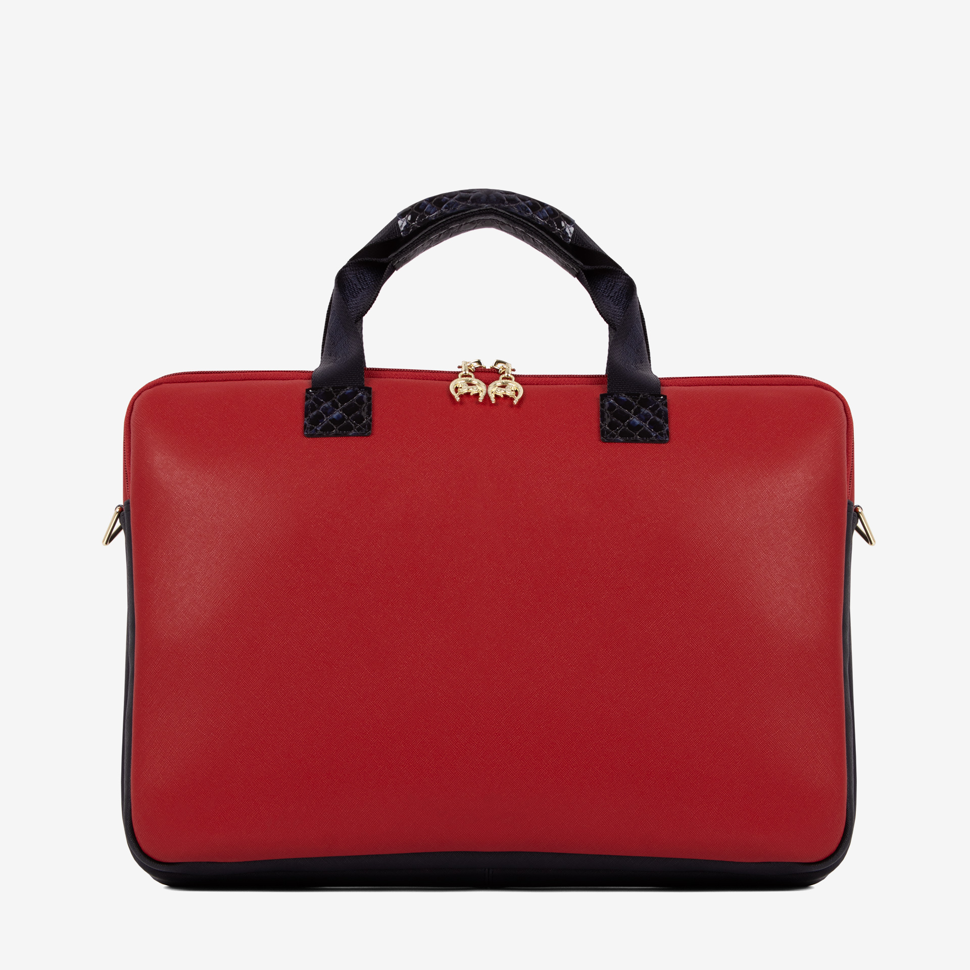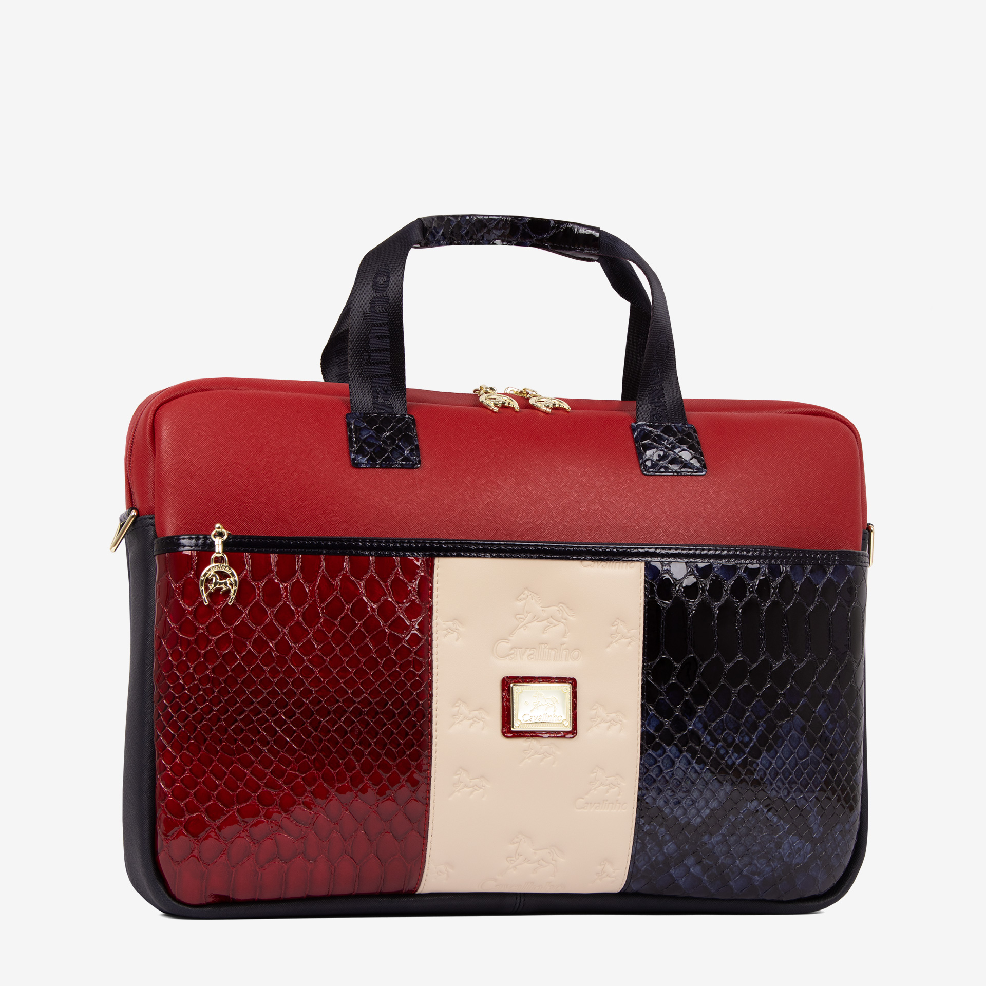 Pasta para portátil ou documentos numa mistura de pele envernizada e genuína, na cor azul, vermelho e bege. Duas divisórias livres, forro em tecido e fechos duplos de correr. Asa dupla de mão em tecido com reforço em pele envernizada e alça tiracolo, ajustável e removível, com proteção de ombro. Bolso médio com fecho de correr na frente da pasta. Aplicações douradas.