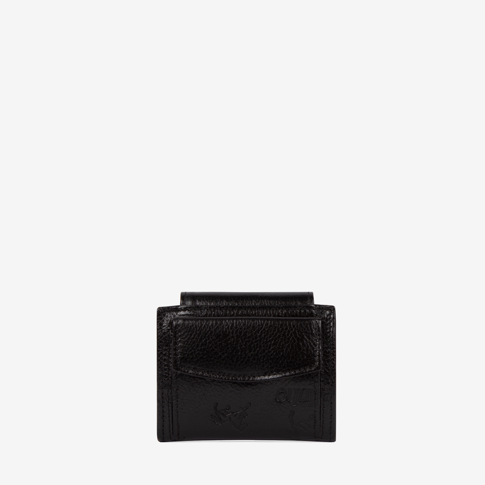 Porta-cartões em pele genuína com gravação na cor preto. Compartimento principal com capacidade para dezasséis cartões em bolsas transparentes e um segundo compartimento para moedas - ambos com fecho de mola. Aplicações prateadas.
