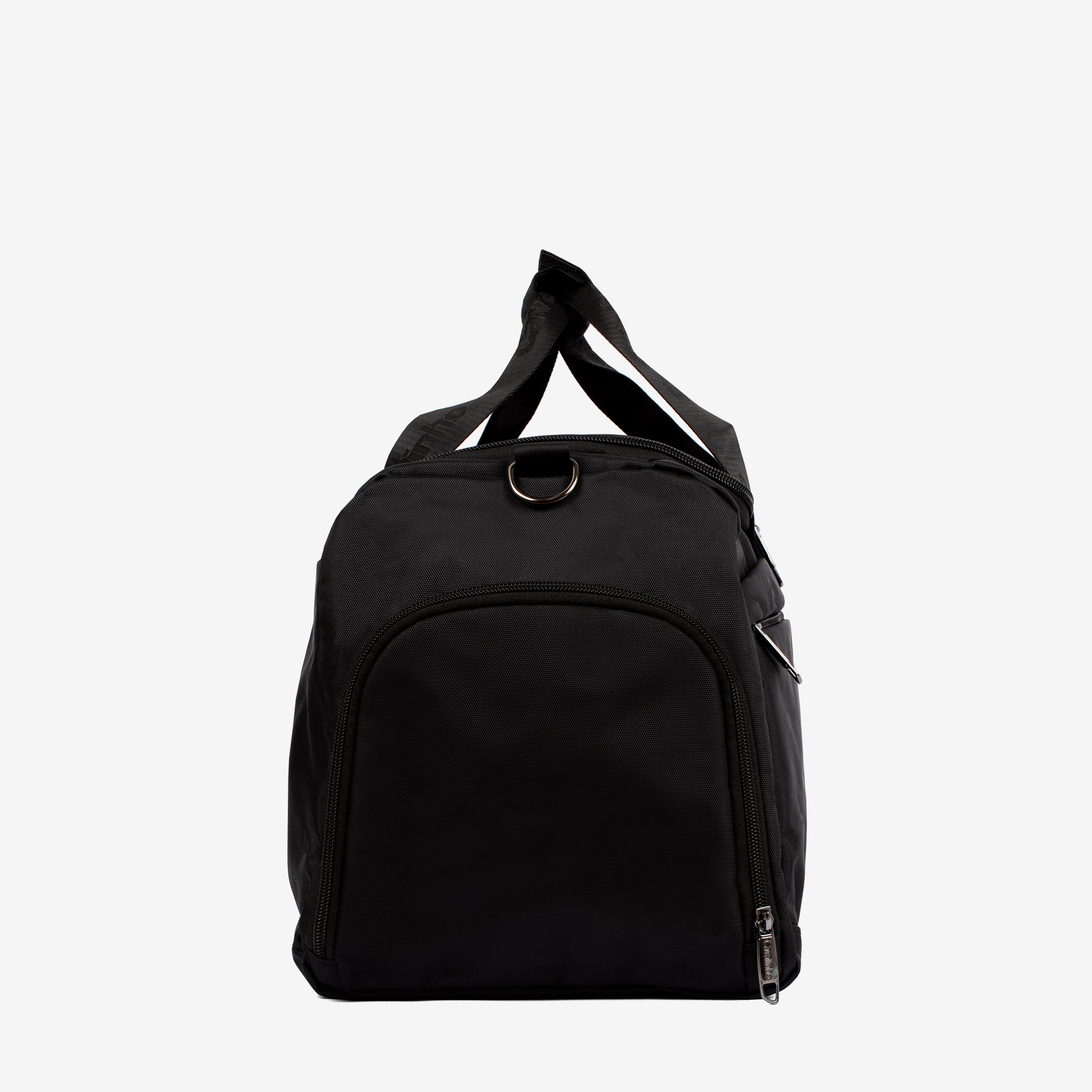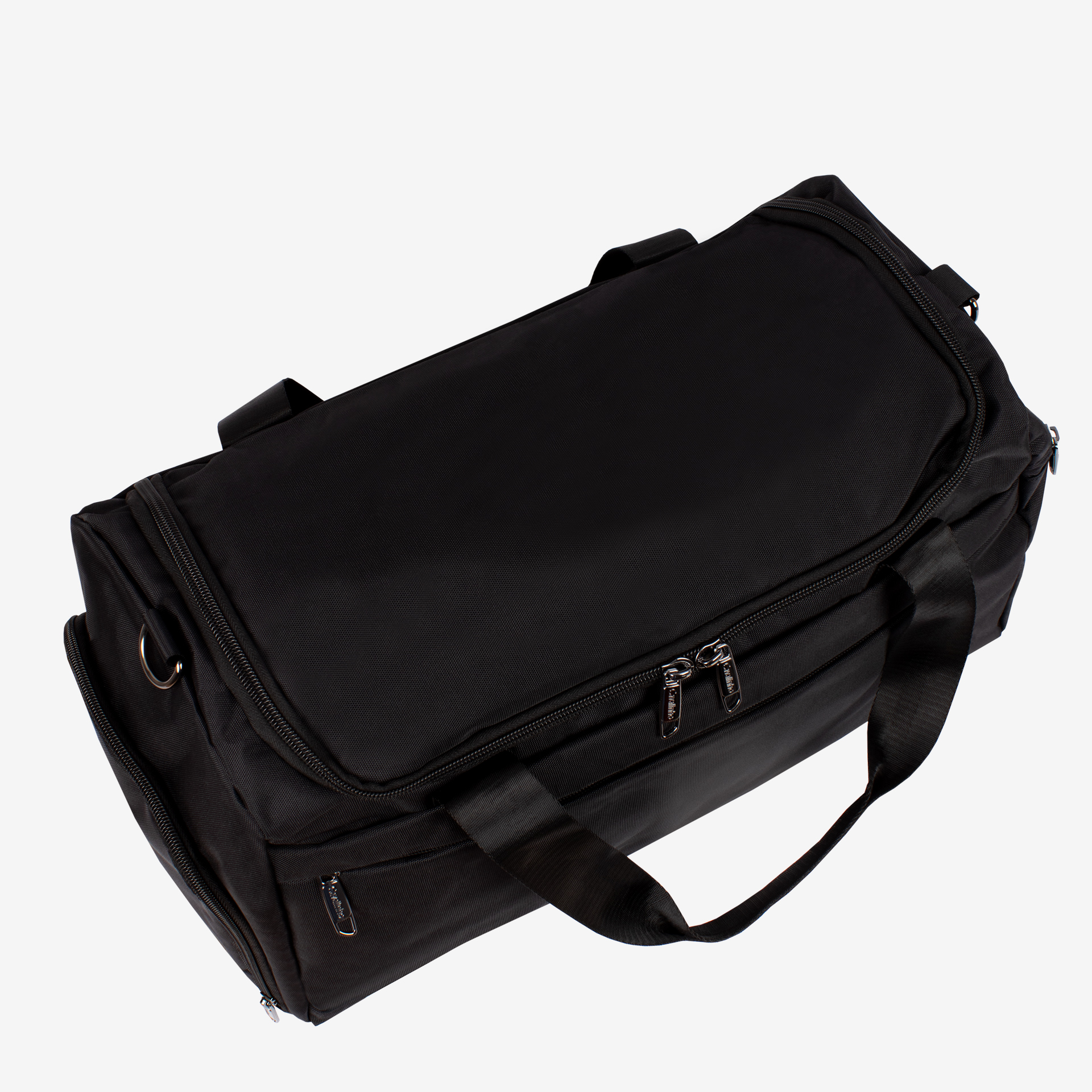 Saco de viagem em nylon com forro interior em tecido Cavalinho. Asas de mão fixas e alça de tiracolo, ajustável e removível. Compartimento principal com abertura D e duplo fecho de correr. No interior, bolso impermeável com fecho de correr e duas divisórias livres. No exterior, três bolsos com fecho de correr e uma divisória isolada para colocar calçado ou outro objeto que deva ser separado dos restantes.