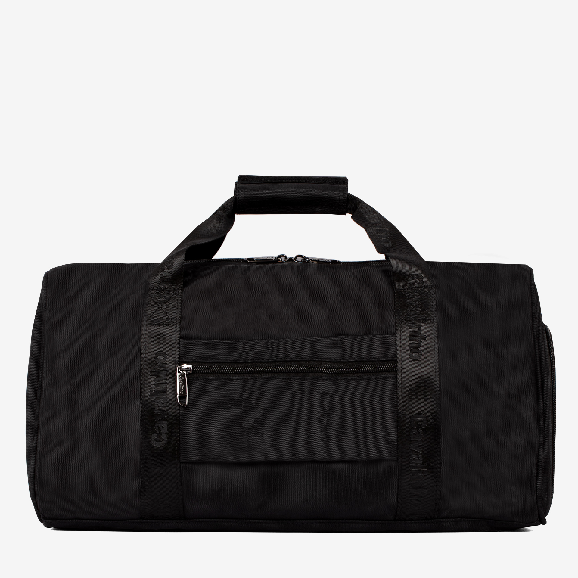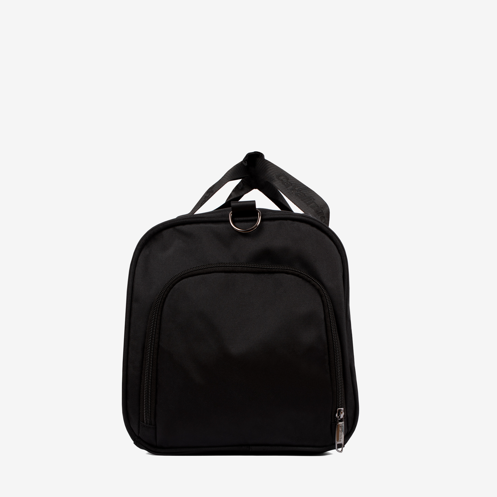 Saco de viagem em nylon com forma alongada. Forro interior em tecido Cavalinho. Asas de mão fixas e alça de tiracolo, ajustável e removível. Compartimento principal com abertura a meio. No interior, bolso impermeável com fecho de correr e duas divisórias livres. No exterior, três bolsos com fecho de correr e uma divisória isolada para colocar calçado ou outro objeto que deva ser separado dos restantes.