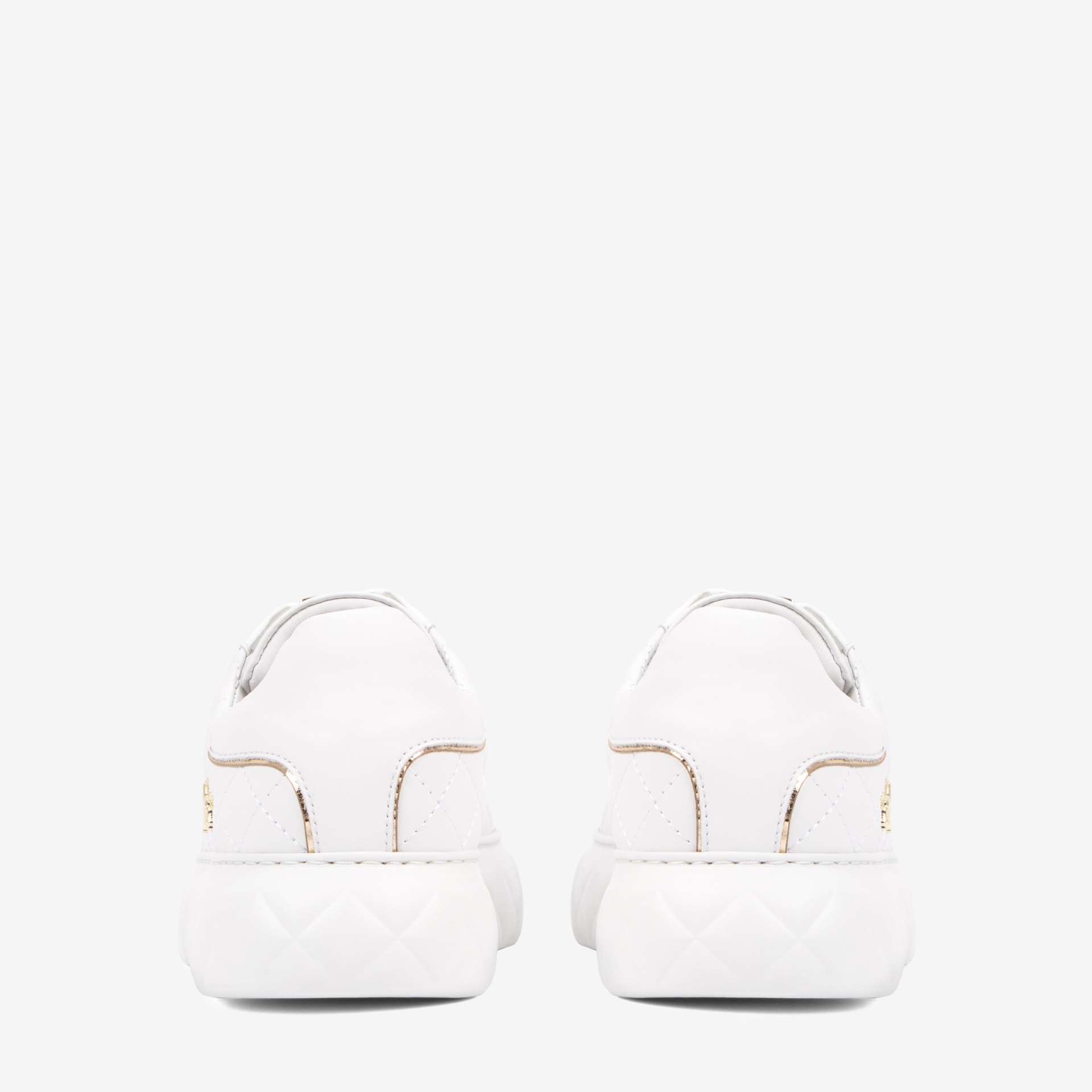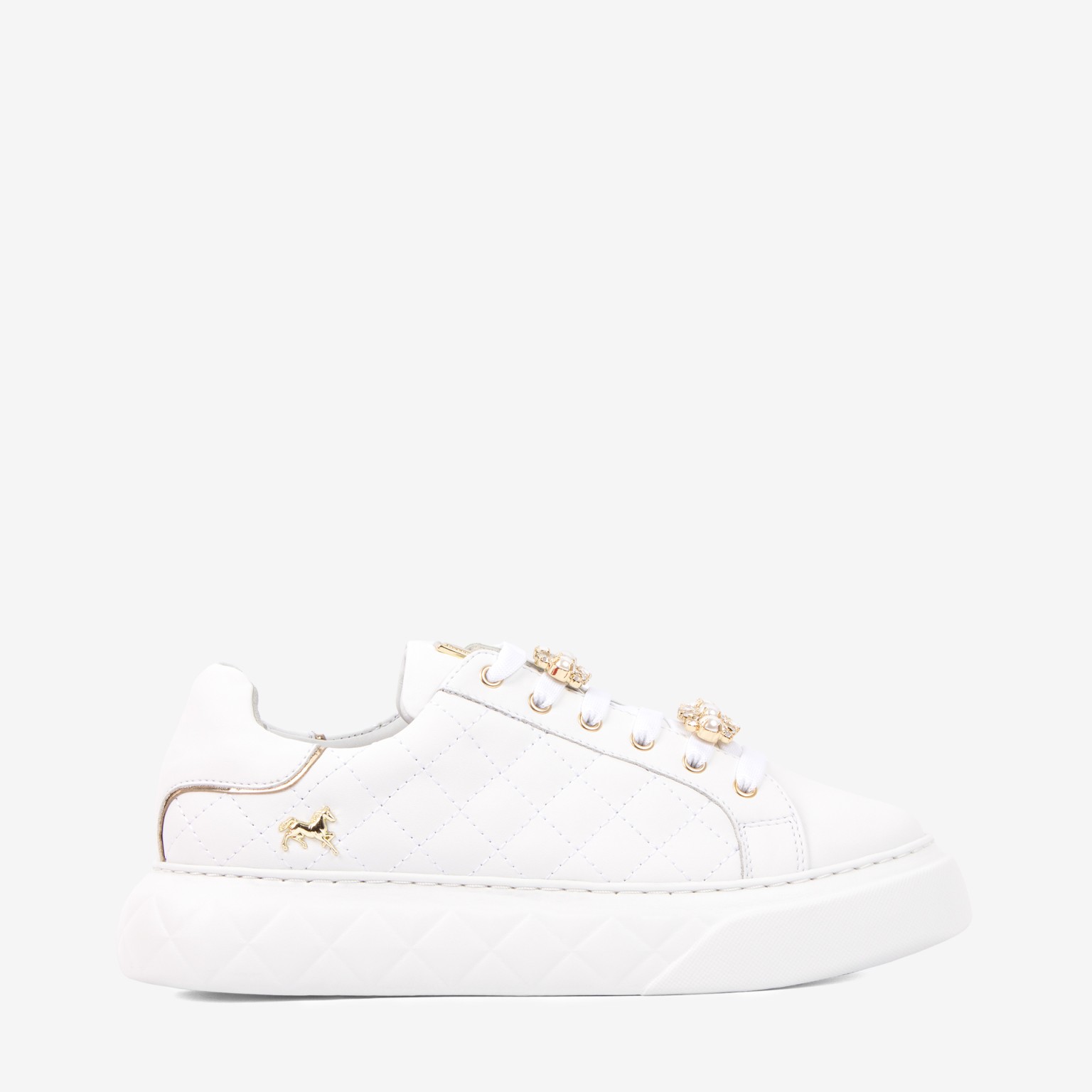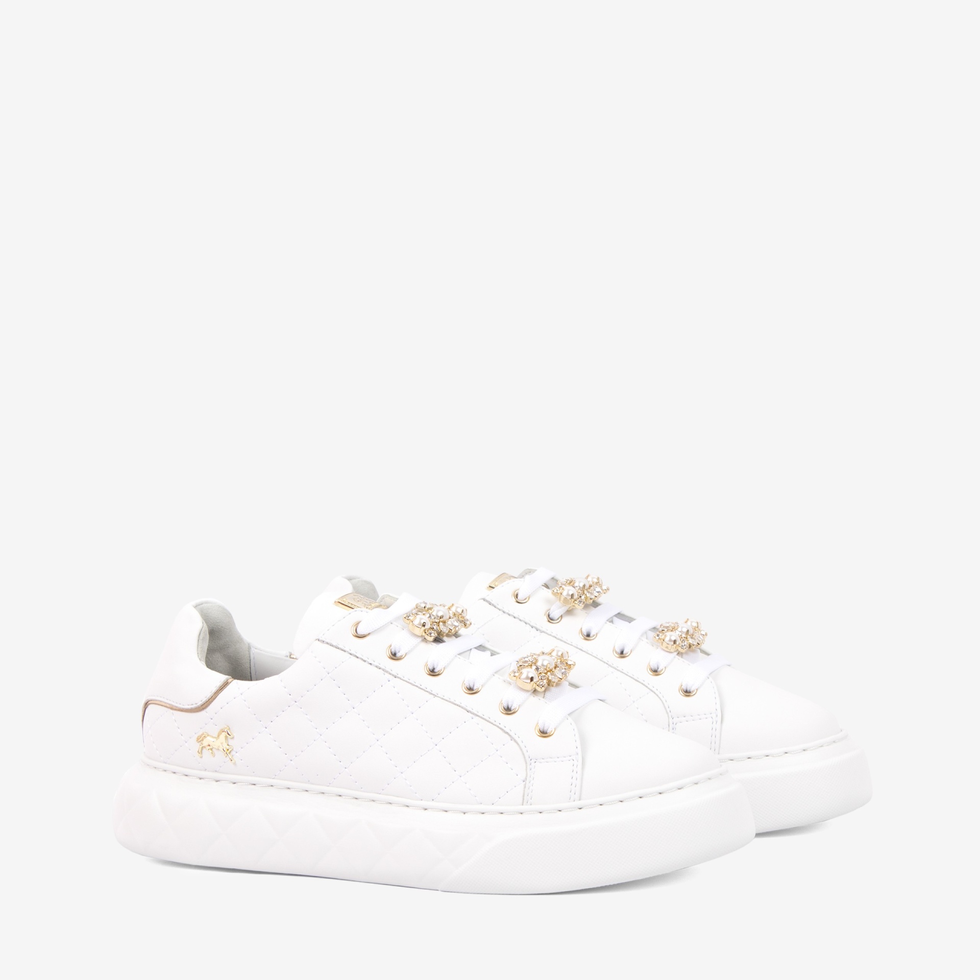 Sapatilhas Eternal em pele genuína, na cor branco. Forro interior em pele e biqueira arredondada. Atacadores em poliéster para um ajuste confortável e dois apliques decorativos em dourado. Sola compensada. Aplicações douradas. Fabricado em Portugal.