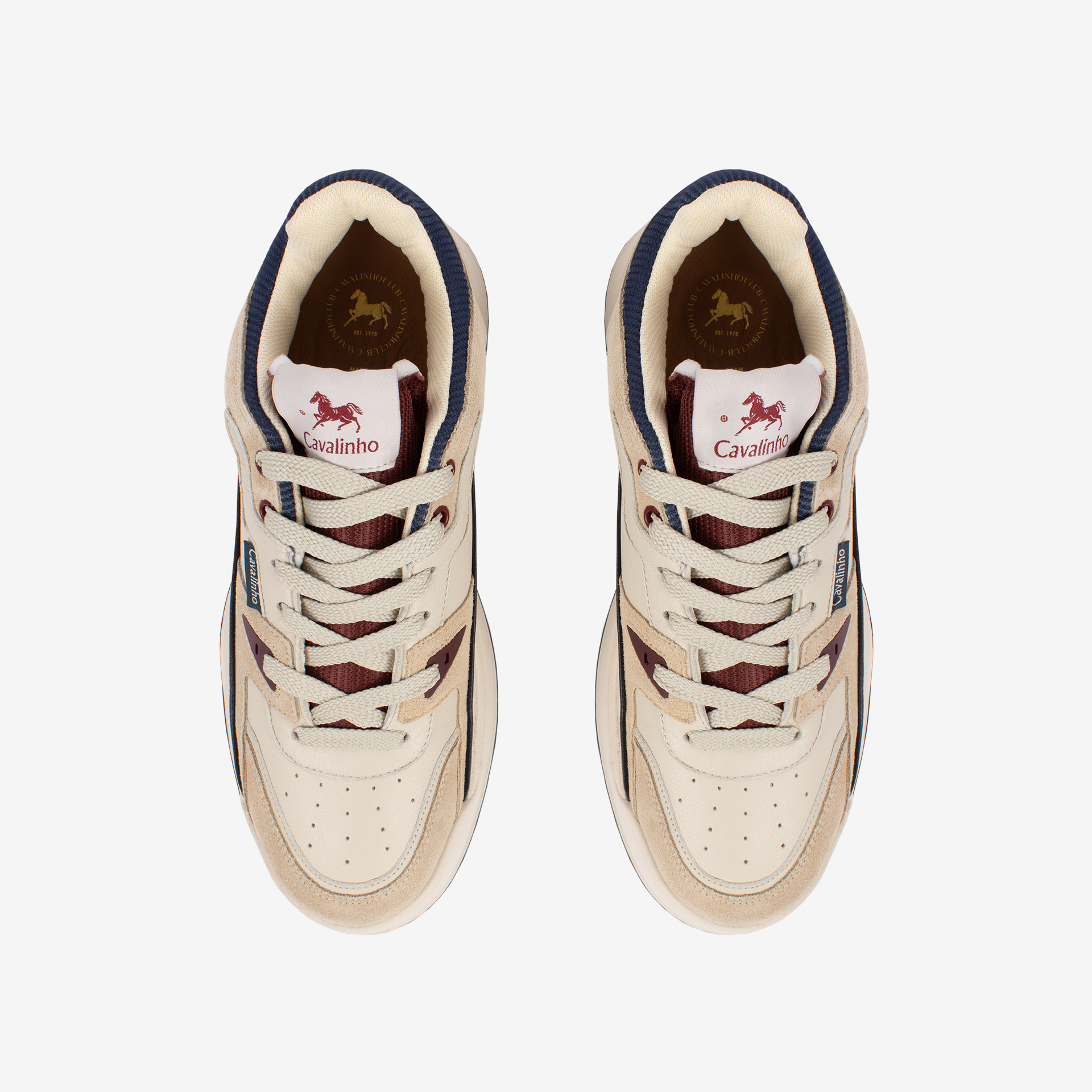 Sapatilhas Revo em pele genuína e acamurçada, na cor bege, com detalhes em bordô e azul. Forro em pele e tecido. Atacadores em poliéster para um ajuste confortável. Fabricado em Portugal.